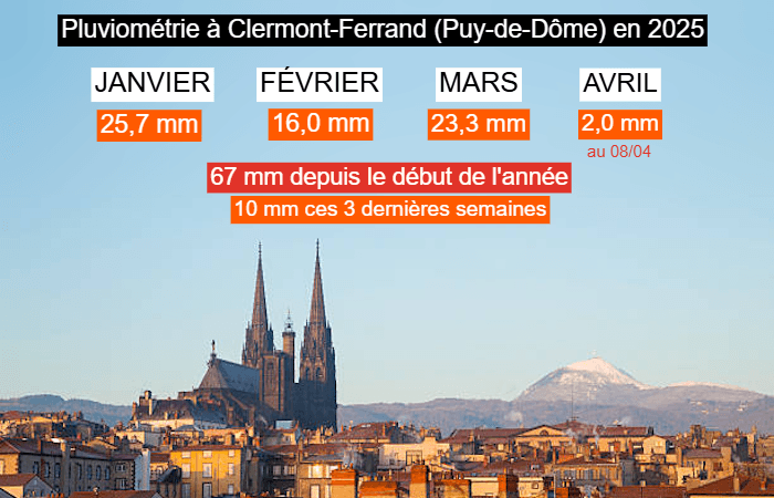 Globalement, ce début d'année 2025 n'a pas été très arrosé dans le Puy-de-Dôme. Si Clermont-Ferrand possède un climat sec en hiver, la pluviométrie est tout de même inférieure aux normales. Sur les trois premiers mois de l'année, il n'est tombé que 65 mm de pluie sur la ville. Plus notablement, seuls 10 mm sont tombés au cours des 3 dernières semaines, contribuant à assécher considérablement les sols en surface à une saison où la végétation en pleine croissance puise l'eau en quantité.
