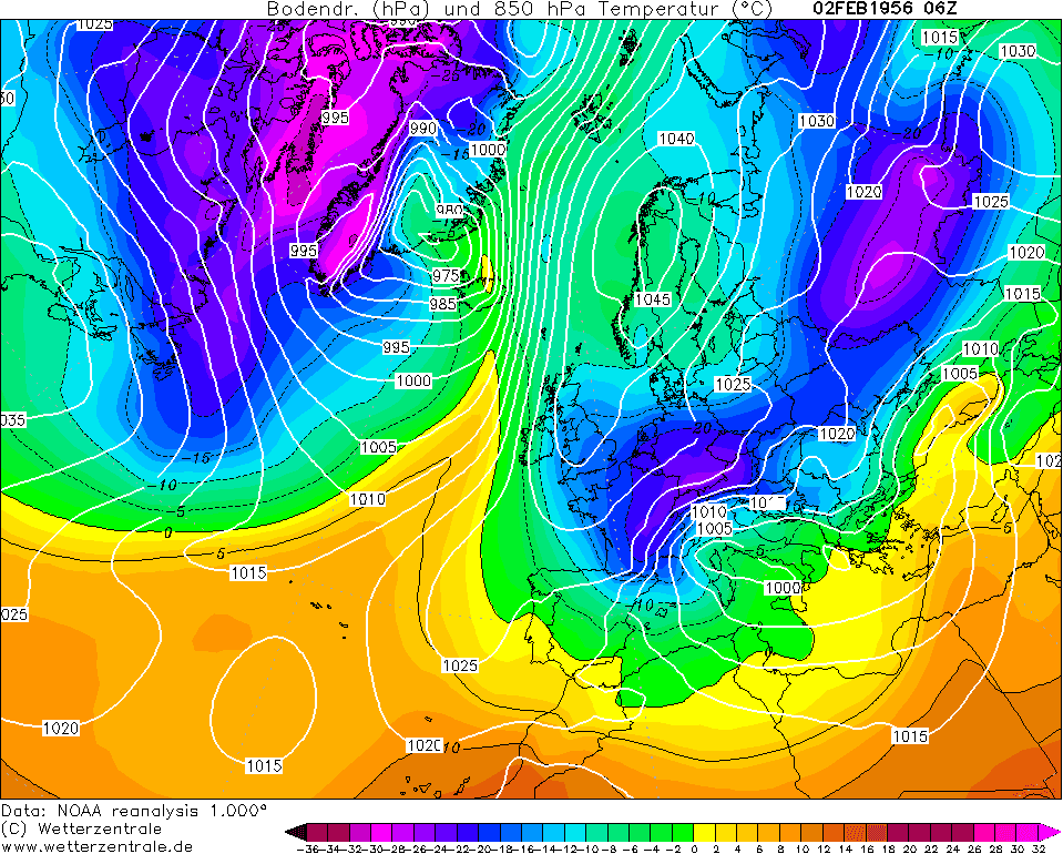 Carte NOAA de la température à 850 hPa, en date du 2 février 1956.