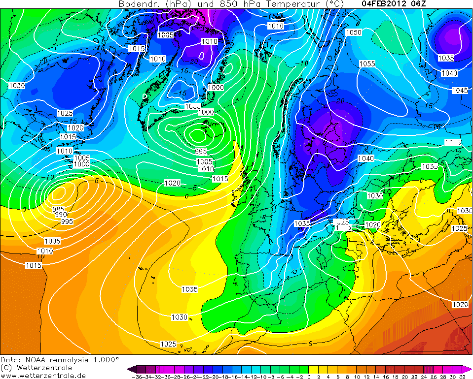 Carte NOAA de la température à 850 hPa, en date du 4 février 2012.