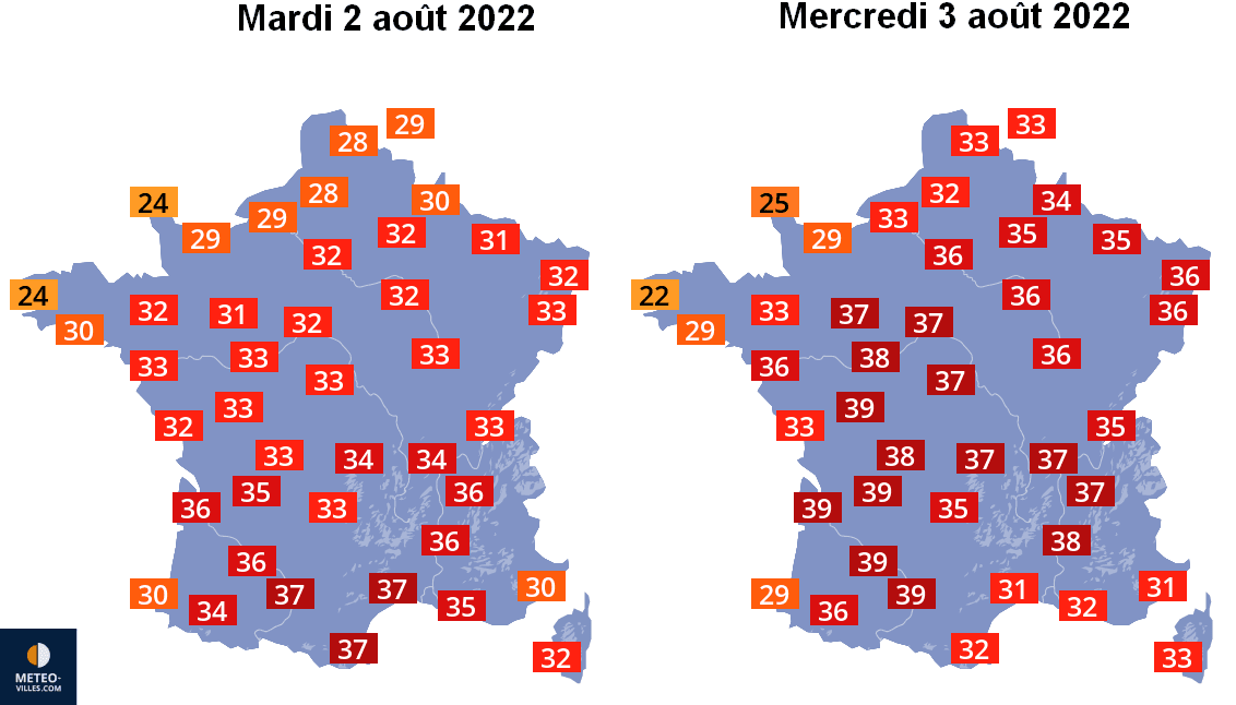Températures maximales envisagées entre mardi 2 et mercredi 3 août 2022 – Météo-Villes
