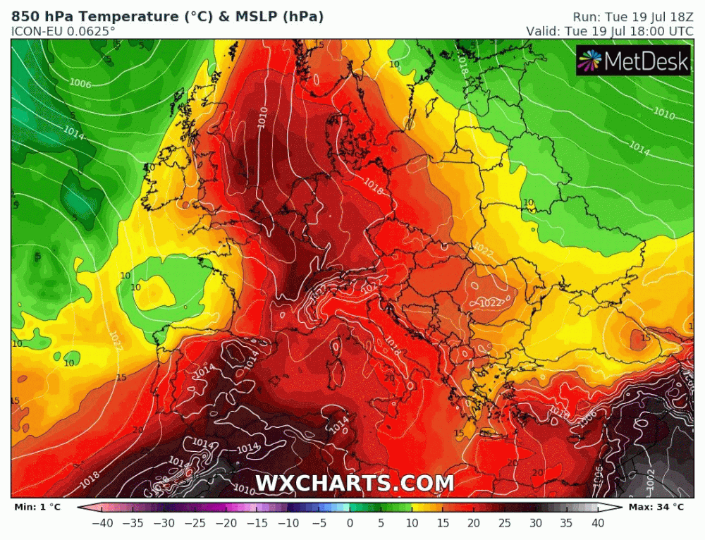 Animation de la masse d'air à 850 hPa (vers 1500) du mardi 19 au vendredi 22 juillet 2022 - via wxcharts.com
