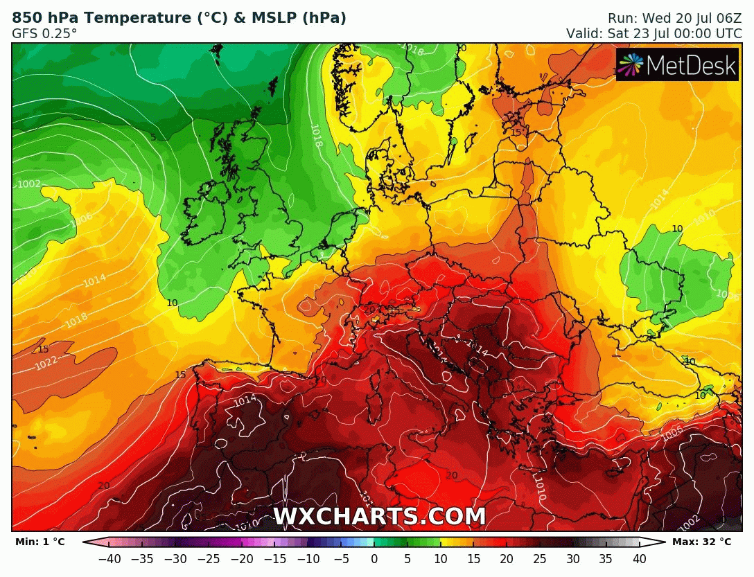 Animation de la masse d'air à 850 hPa (vers 1500) du samedi 23 au mardi 26 juillet 2022 - via wxcharts.com