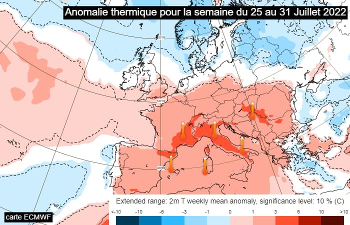 Modélisation de l'anomalie thermique pour la semaine du lundi 25 au dimanche 31 juillet 2022 - via ECMWF
