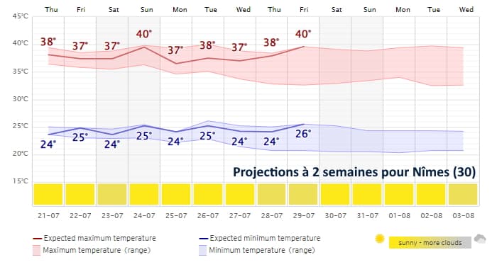 Projections des températures à Nîmes jusqu'au 3 août 2022 - via meteologix.com