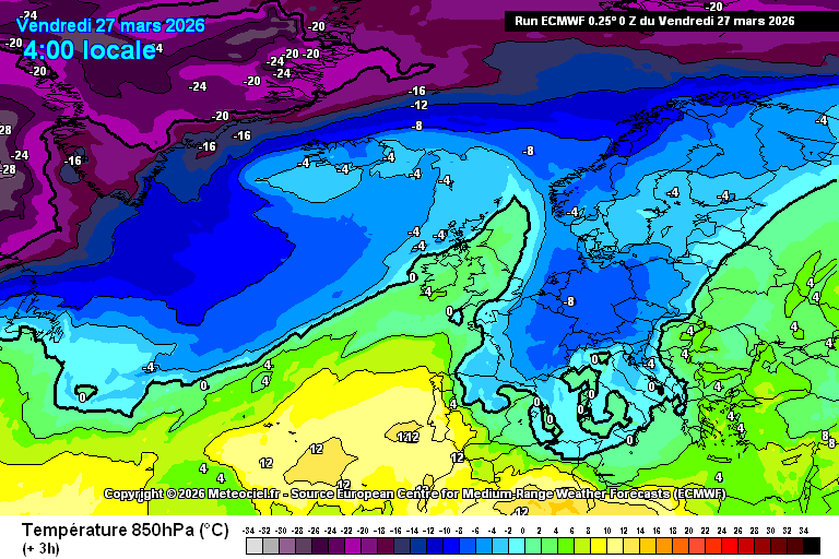 Animation des températures à 850 hPa sur l'Europe du 27 mars au 3 avril – Modèle ECMWF via meteociel