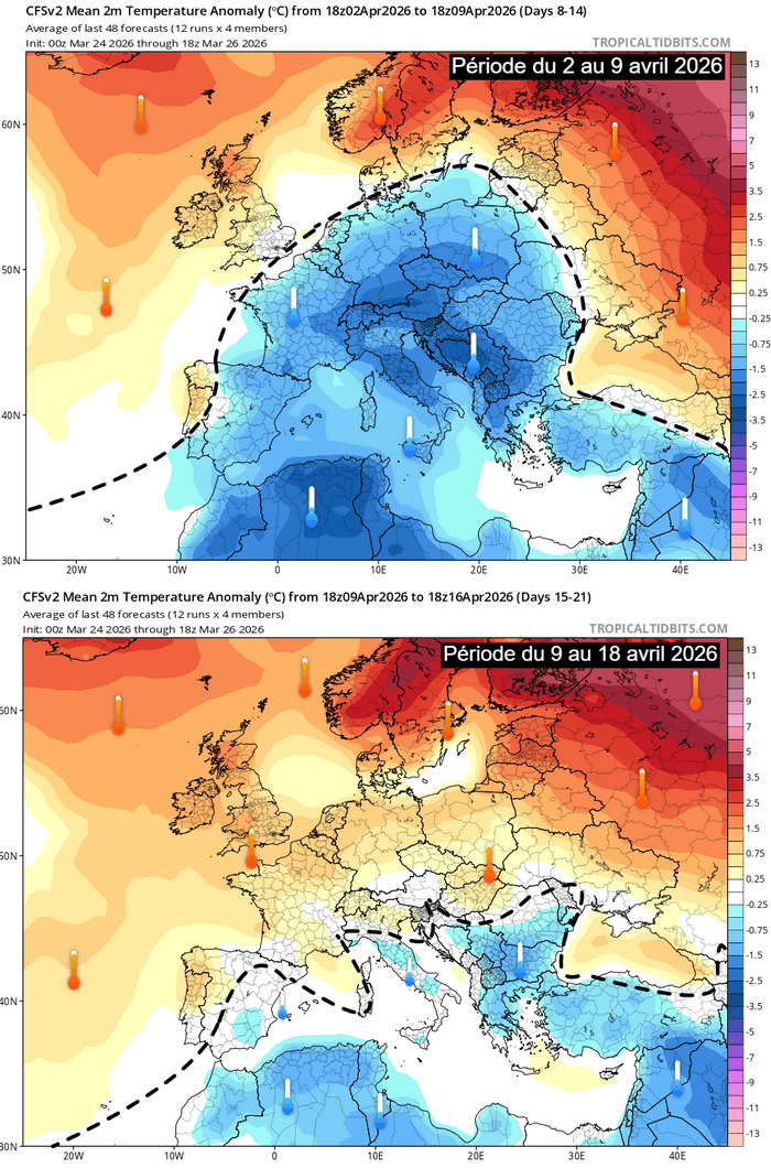 Il conviendra néanmoins de confirmer ce scénario car les modèles divergent à partir de la seconde partie de la semaine prochaine. Selon le modèle américain, la masse d'air pourrait rester très fraîche sur notre pays jusqu'à la fin de la première décade d'avril avant une remontée des températures par la suite, un regain de douceur qui se montrerait donc plus tardif que sur le modèle européen.