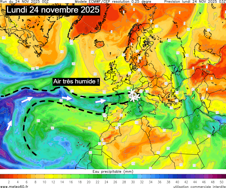 Air tropical très humide advecté vers la France ce 24 novembre 2025 – Carte : meteo60.fr
