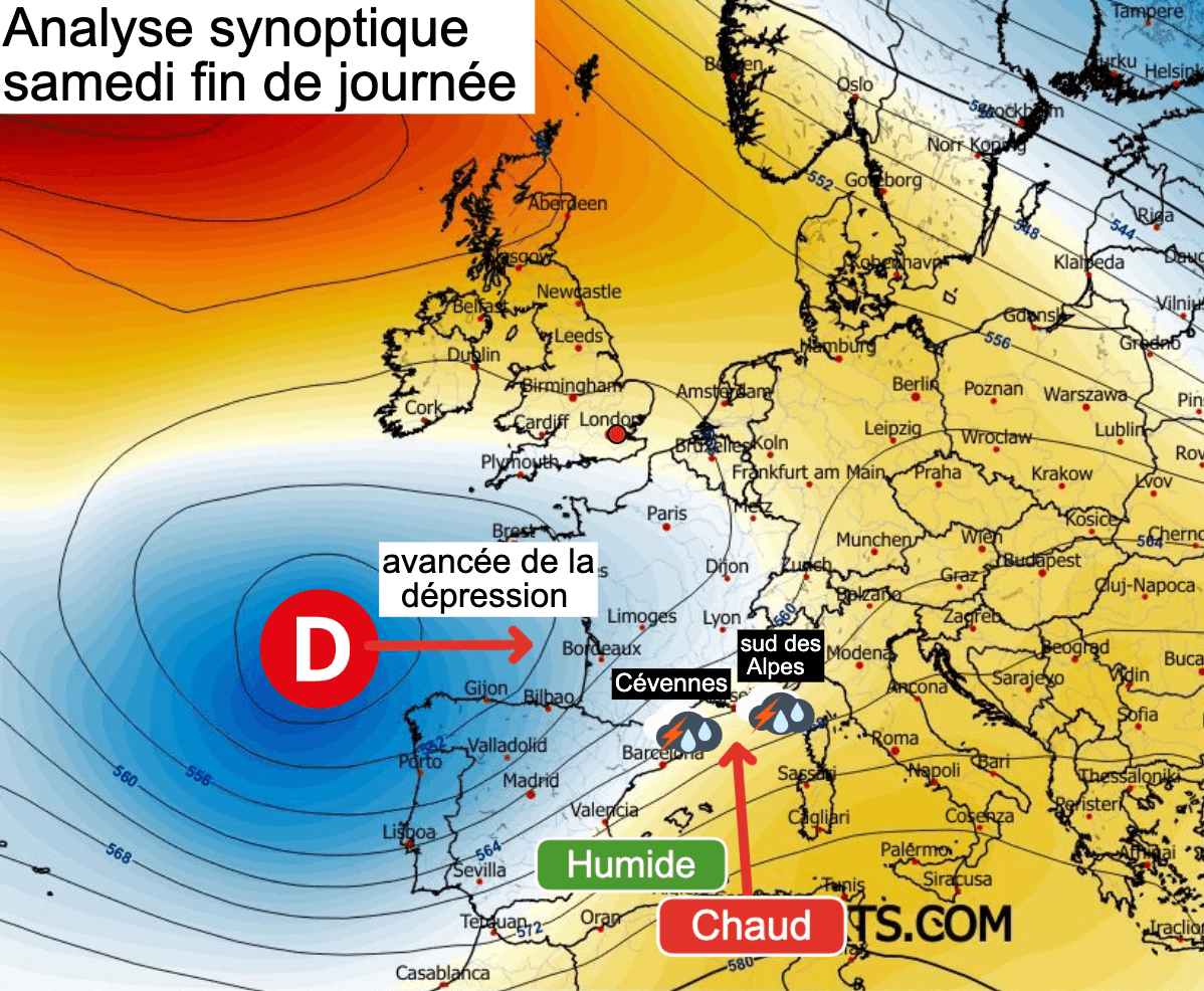 Après avoir stationné pendant plusieurs jours sur l’océan Atlantique, la dépression Claudia, caractérisée par un courant d’air très doux en provenance d’Afrique du Nord, s’approche désormais des côtes françaises.  Cette dépression est à l’origine d’une instabilité atmosphérique et de remontées d’air humide et chaud en provenance de la Méditerranée.  Plusieurs vagues pluvieuses et orageuses progressent dans ce courant de sud méditerranéen et se heurtent aux versants sud du Massif central et des Alpes, atteignant même le Lyonnais.