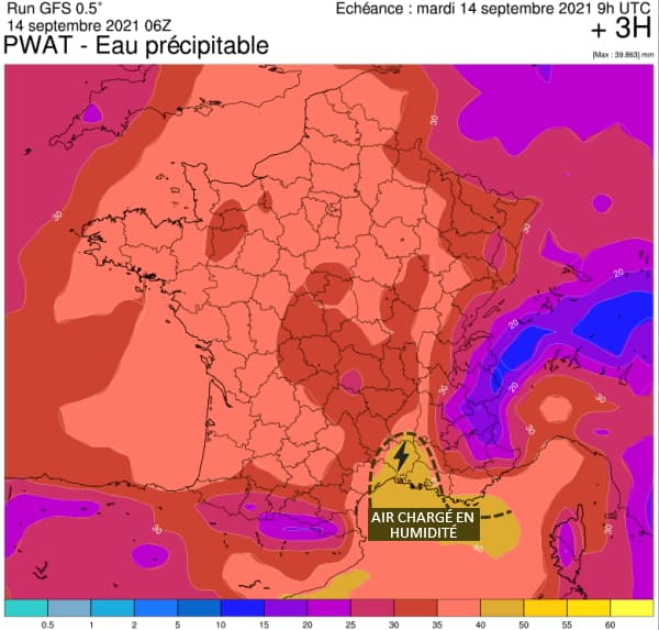 L'eau précipitable est la quantité d'eau qui pourrait tomber si toute la vapeur d'eau contenue dans l'atmosphère venait à se condenser et à retomber sous forme de pluie. Elle est un bon indicateur du potentiel pluvieux des orages. Ce matin du mardi 14 septembre 2021, des niveaux élevés d'eau précipitable concernaient le Languedoc avec des valeurs à plus de 40 mm.