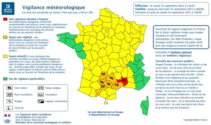 Carte de vigilance en vigueur le mardi 14 septembre 2021 en mi-journée - Météo France
