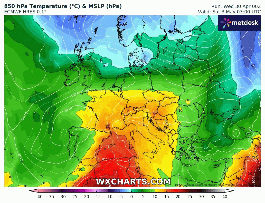 Température de la masse d'air vers 1500m du samedi 3 au mardi 6 mai 2025 - wxcharts.com