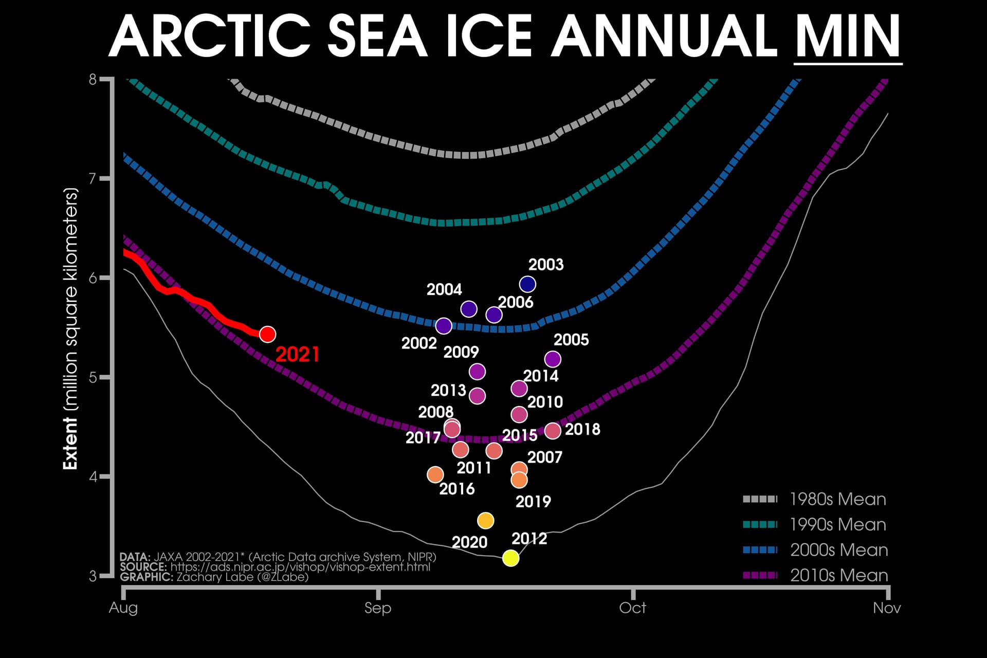 Cette valeur pourrait sembler encourageante par rapport aux années précédentes mais est à grandement relativiser. En effet, la moyenne du minimum annuel lors de la période 1981-2010 est située à 6,344 millions de km², soit plus d'un million de plus que durant cette année 2021.
