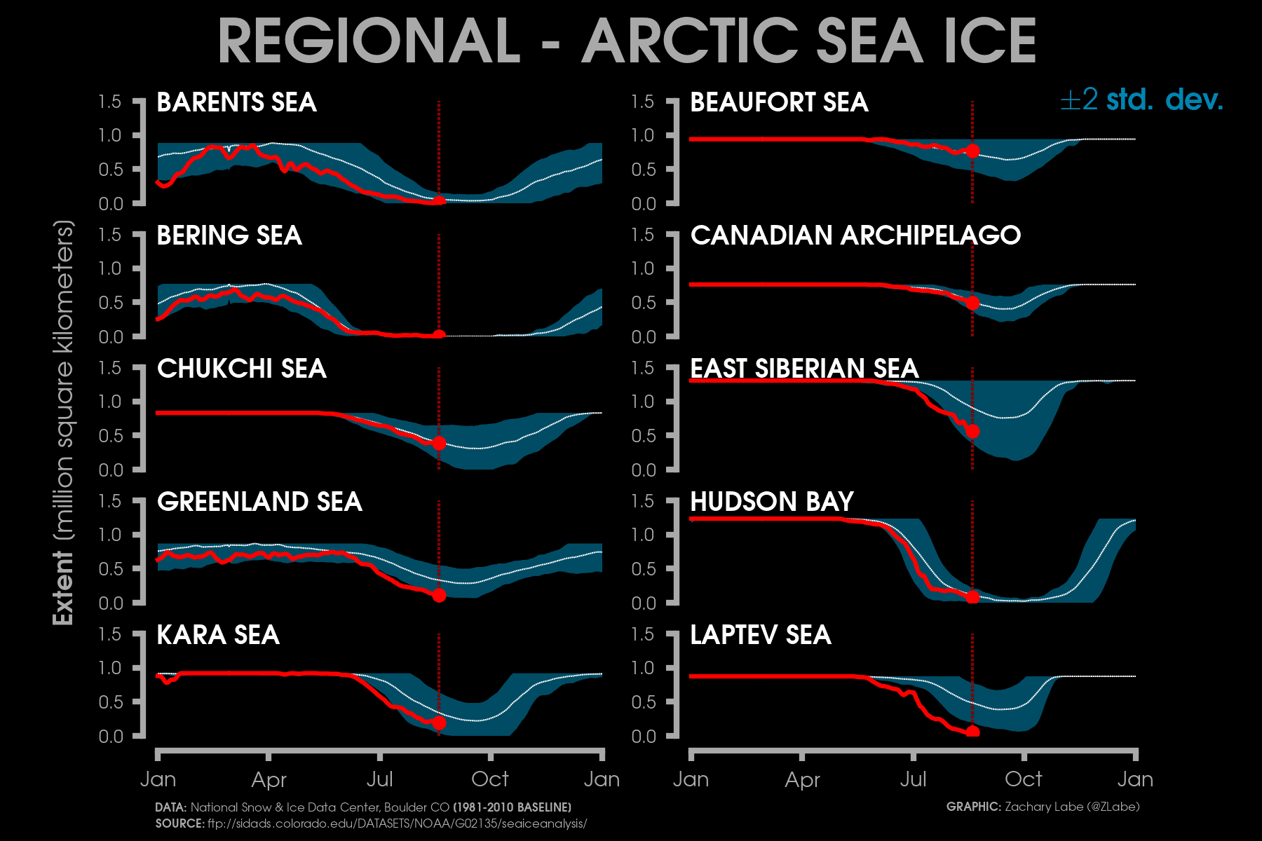 *Note : les statistiques graphiques "Zachary Labe" ci-dessus, se basent sur des données issues de l'Agence d'exploration aérospatiale japonaise (JAXA) dont les valeurs de superficie des glaces peuvent différer par rapport aux données américaines du NSIDC.