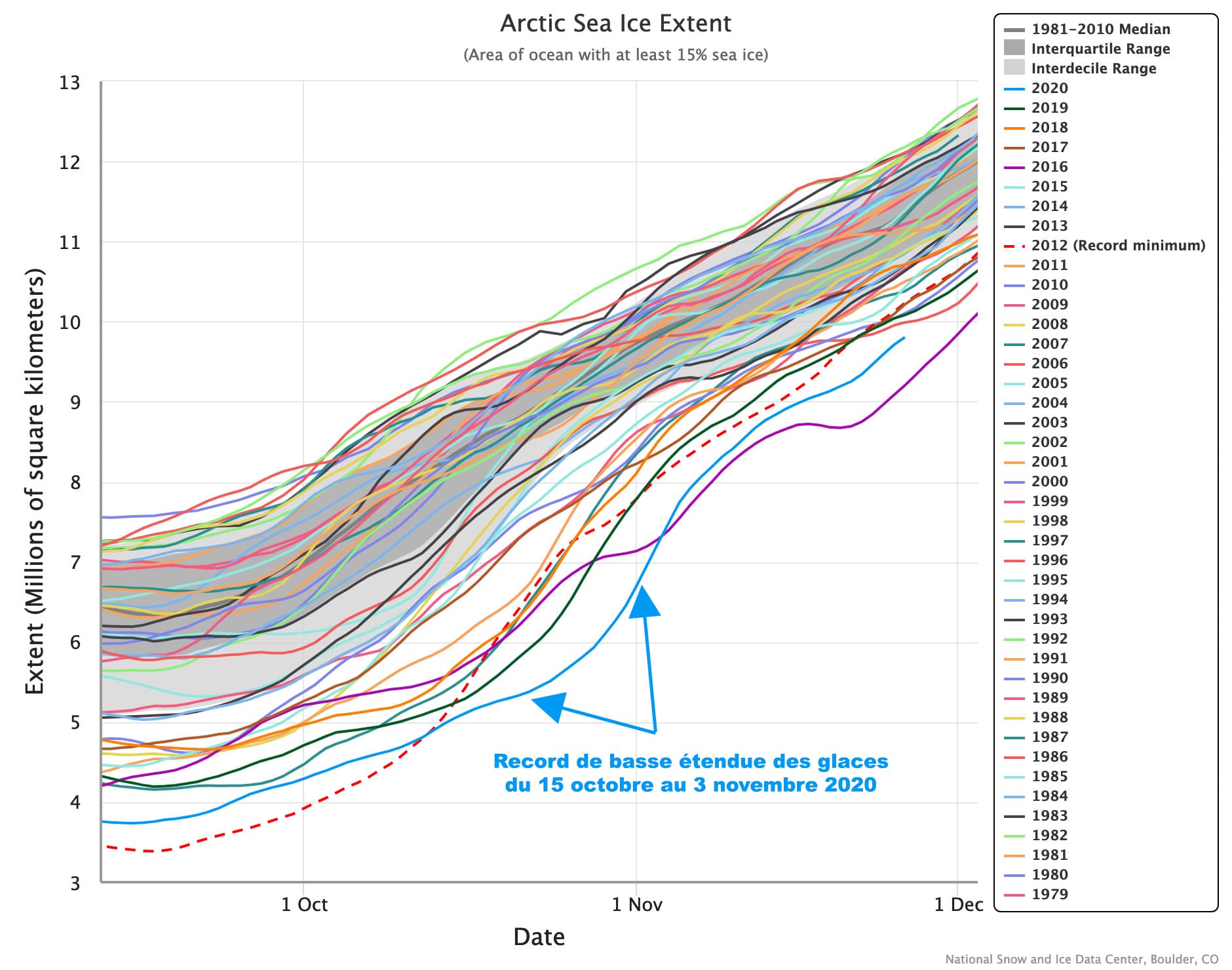 Avec une étendue moyenne estimée à 5.28 millions de km2, il s’agissait de la pire statistique pour un mois d’octobre depuis le début de ces mesures en 1979. Selon le « National Snow and Ice Data Center », centre américain de référence dans la recherche polaire, des records ont même été battus quotidiennement du 15 octobre au 3 novembre, en dessous des niveaux de 2019 ou 2016.