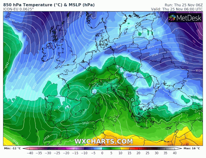 Évolution de la masse d'air à 850 hPa (vers 1500m) du jeudi 25 au mardi 30 novembre 2021 - via wxcharts.com