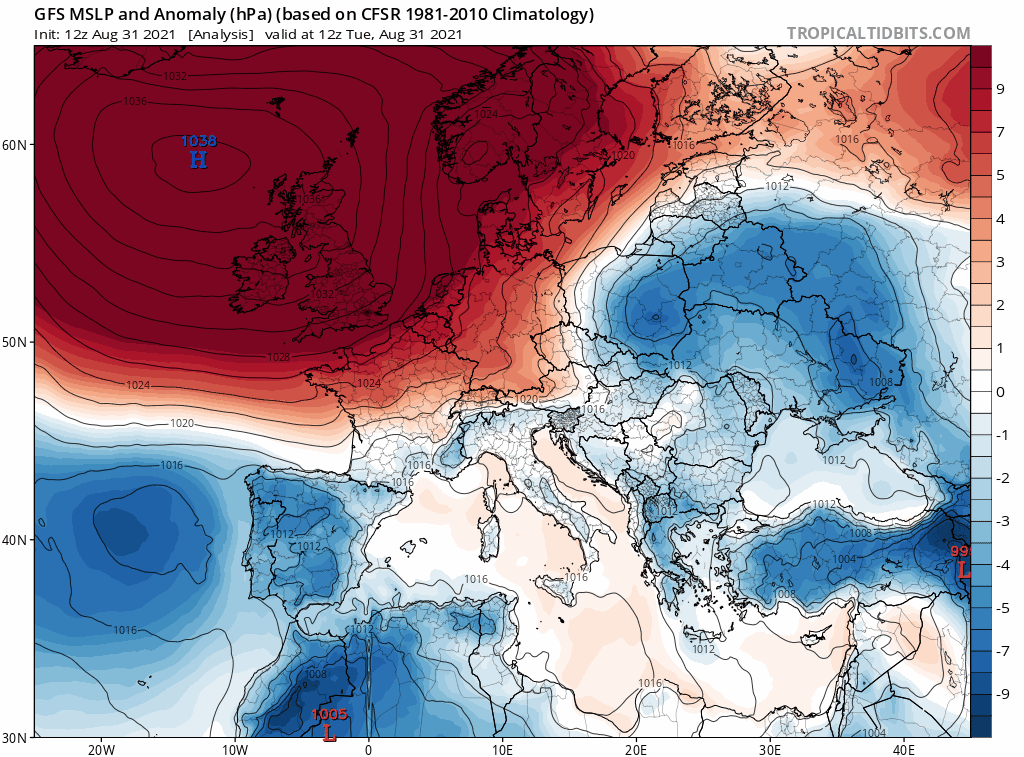 Anomalies de pressions (rouge = anticyclone, bleu = dépression) du mardi 31 août au mardi 7 septembre 2021 - via tropicaltidbits.com