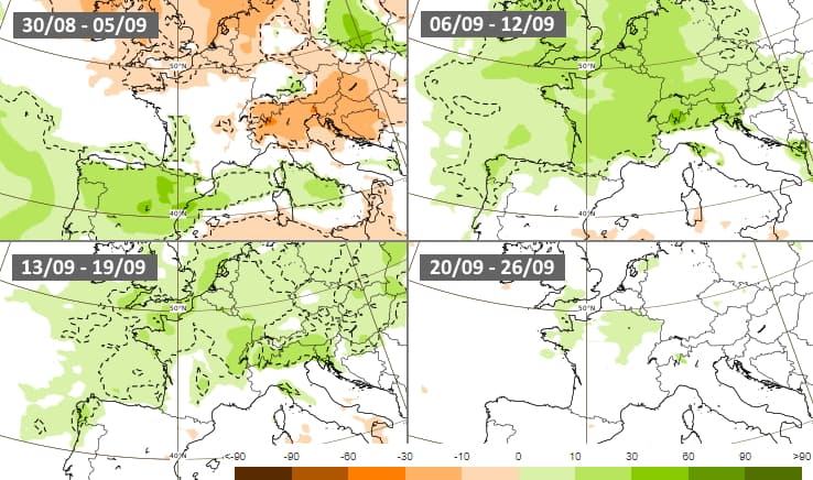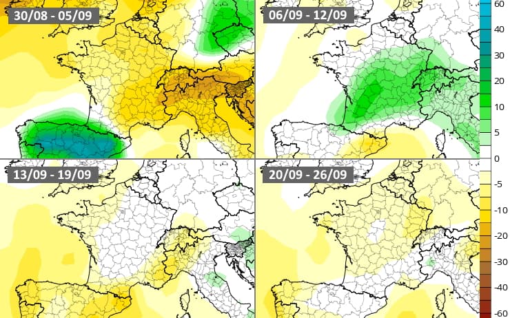Selon le scénario du modèle européen, le début du mois de septembre 2021 serait classique avec le développement d'une instabilité orageuse par le sud-ouest. Les conditions instables prendraient l'avantage sur la plupart des régions en semaine du 6 au 12 septembre. Ces anomalies humides pourraient ensuite persister sur la moitié nord en seconde quinzaine du mois tandis qu'aucune anomalie ne se détache dans le sud.