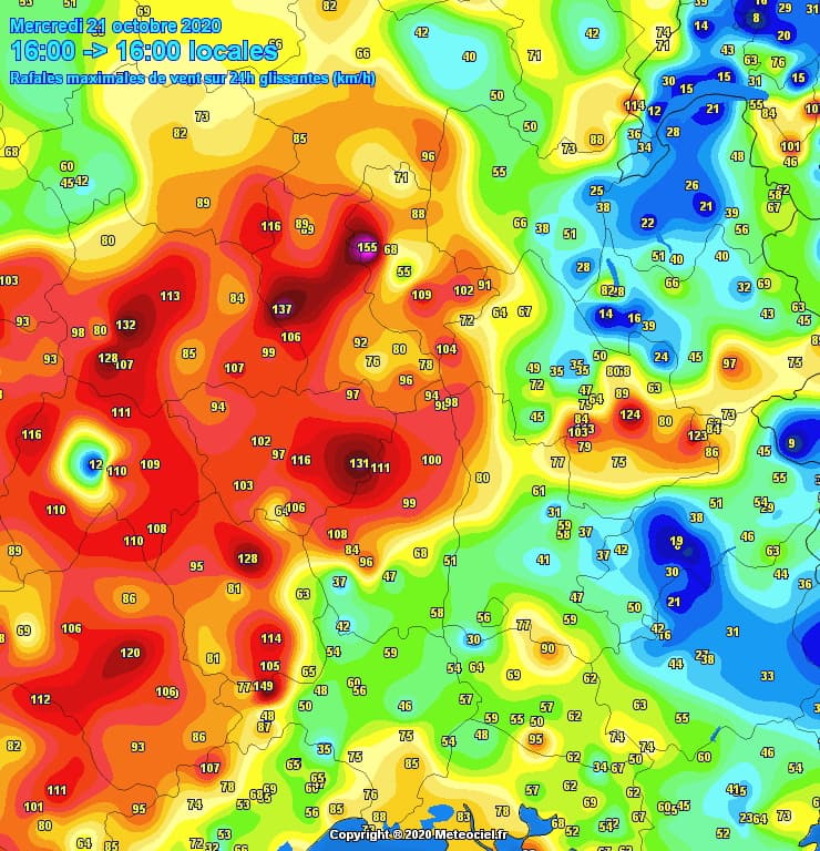 Rafales maximales dans la nuit du 21 au 22 octobre 2020 sur les Pyrénées - via Guillaume Woznica / LCI