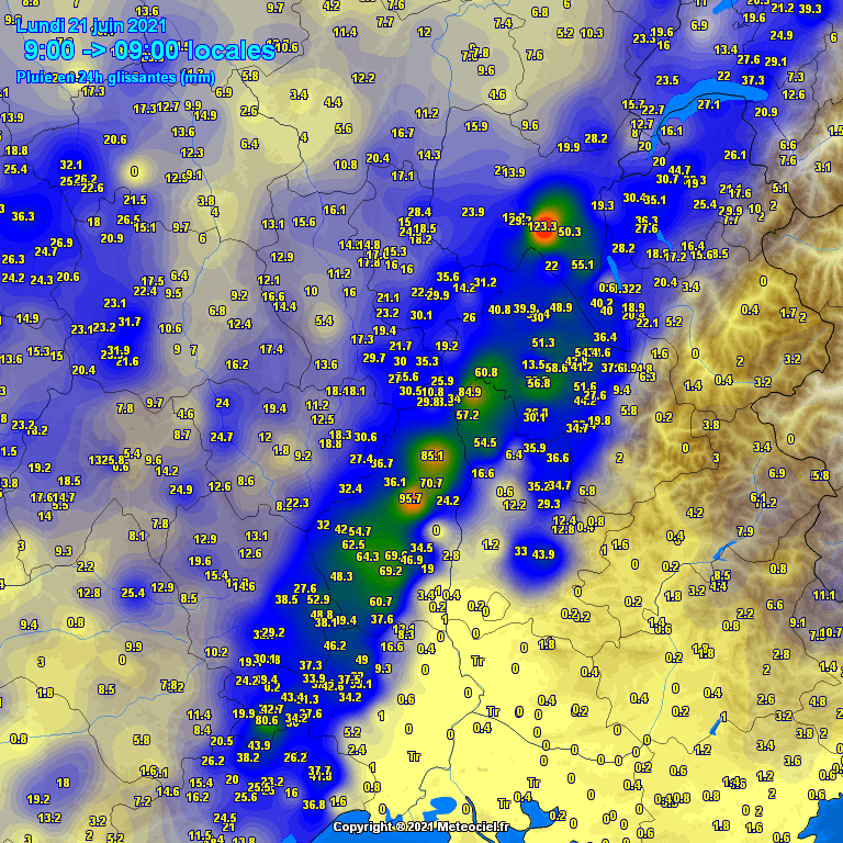 Cumuls de précipitations en 24h glissantes entre le dimanche 20 juin 09h et le lundi 21 juin 09h - Via météociel.fr