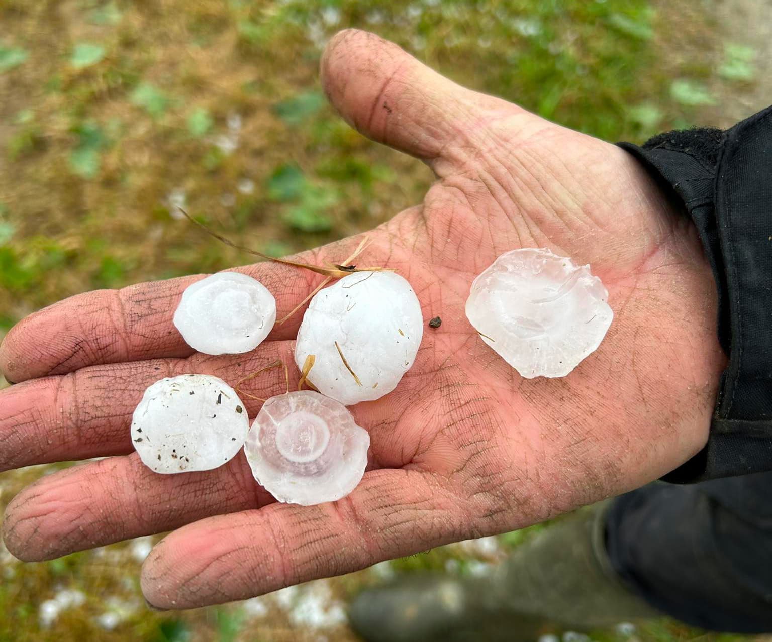 Grêlons de 3 à 4 cm de diamètre à Castex dans le Gers en fin de journée du 10 mai 2025 – Photographie : Nathalie Dutaut