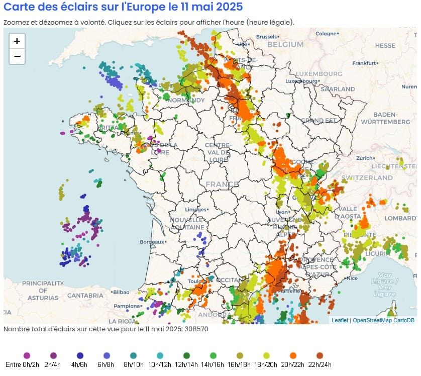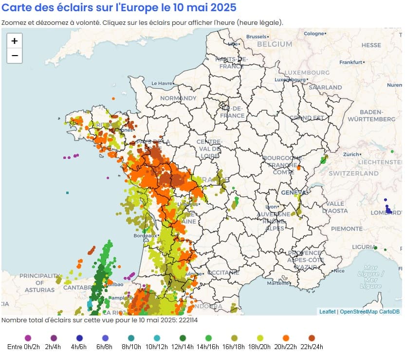 Éclairs détectés sur la France durant la journée du 10 mai 2025 – Via meteo60.fr