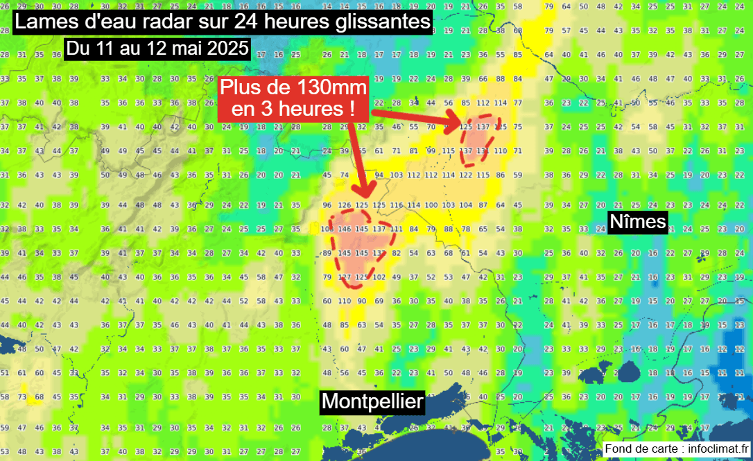 Lames d'eau radar entre le 11 et le 12 mai 2025 sur le Languedoc - Via Infoclimat.fr