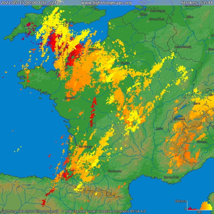 Les orages les plus actifs ont éclaté en Aquitaine mais aussi sur un axe allant du nord de l'Auvergne à la Normandie en passant par une partie du Centre et de la Bourgogne, l'Île-de-France ainsi que le nord des Pays de la Loire. Par ailleurs, de nombreux orages ont éclaté sur les reliefs des Alpes. Au total, ce sont plus de 30.000 décharges de foudre qui ont été enregistré sur le territoire français ce dimanche 15 mai 2022, la plus haute valeur sur 24h depuis le 26 septembre 2021 !
