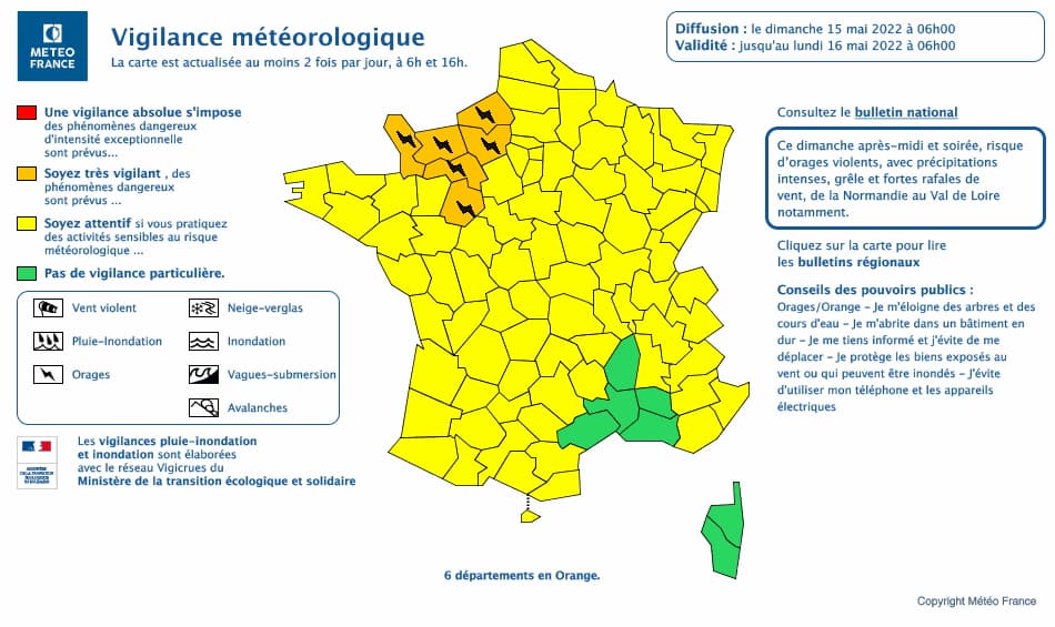 Carte de vigilance émise le dimanche 15 mai 2022 à 06h - via Météo France