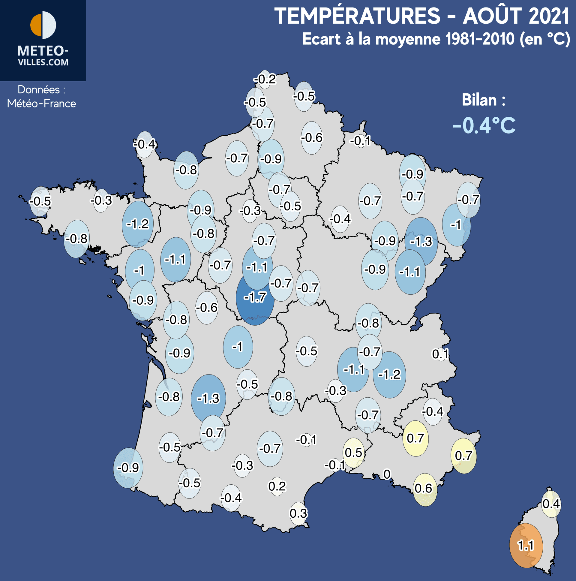 Partout ailleurs, la fraîcheur a dominé dans l'ensemble avec un déficit thermique qui dépasse le degré de Rhône-Alpes à l'Alsace d'une part, et du Centre-Ouest au Nord-Ouest d'autre part. Les anomalies les plus marquées s'élèvent à -1.2°C pour Rennes et Grenoble, -1.3°C à Luxeuil et Bergerac, et jusqu'à -1.7°C à Châteauroux. Pour Paris, le bilan de ce mois d'août est de -0.7°C.