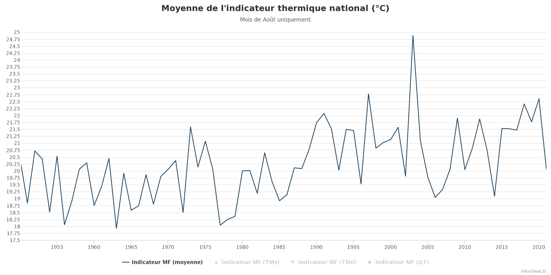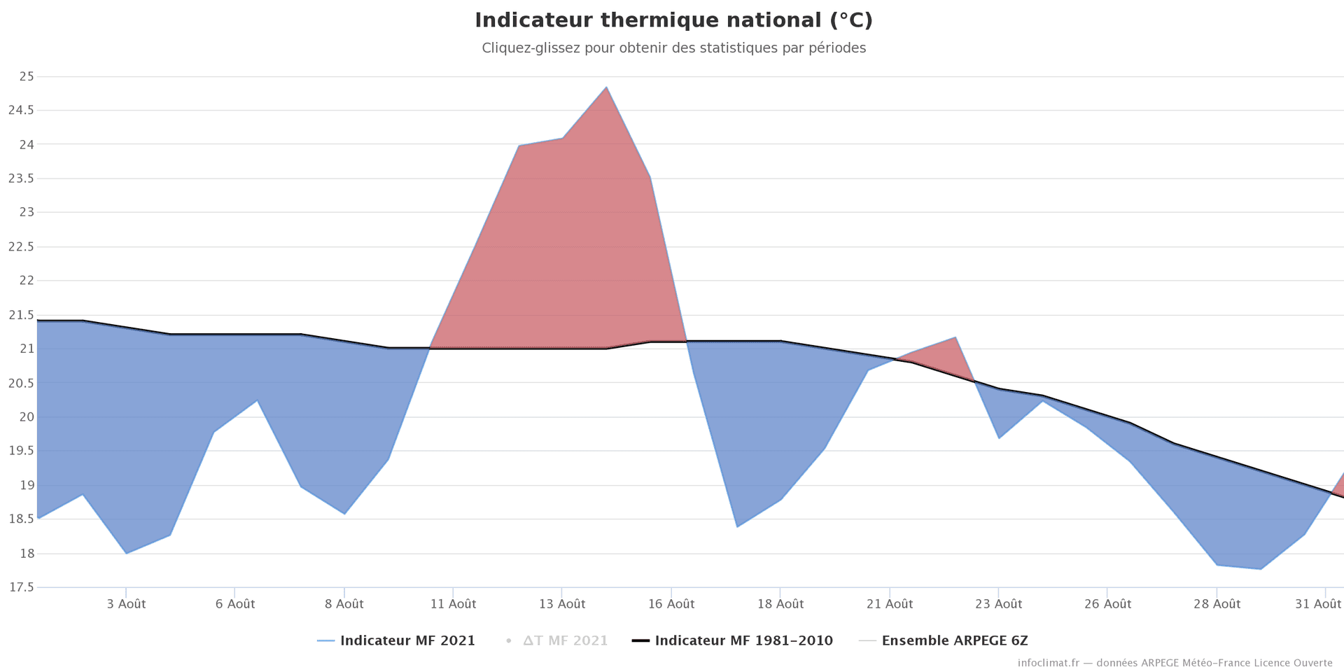 Avec une température moyenne de 20.0°C à l'échelle nationale, le déficit thermique s'est élevé à -0.5°C en août 2021. Il s'agit du mois d'août le plus frais depuis 2014 en France, et fait suite à un été 2020 radicalement opposé (température moyenne de plus de 22.5°C).