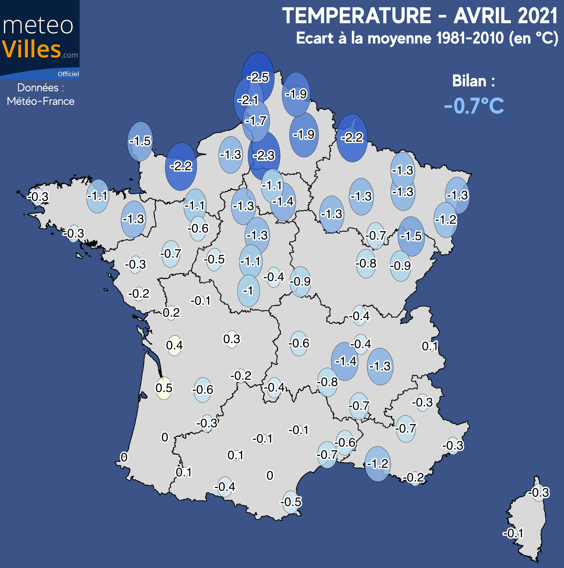 Au niveau géographique, ce sont les régions situées au nord de la Loire qui ont subi le froid le plus marqué avec une anomalie thermique en dessous des -1°C. Au nord de la Seine et surtout sur les Hauts-de-France, certaines villes ont même une anomalie de -2°C (-2.1°C au Touquet, -2.2°C à Charleville-Mézières et Caen, -2.3°C à Beauvais et jusqu'à -2.5°C à Calais). La capitale a été concerné par ces conditions peu printanières avec une anomalie de -1.1°C au parc Montsouris par rapport à la moyenne 1981-2010.
