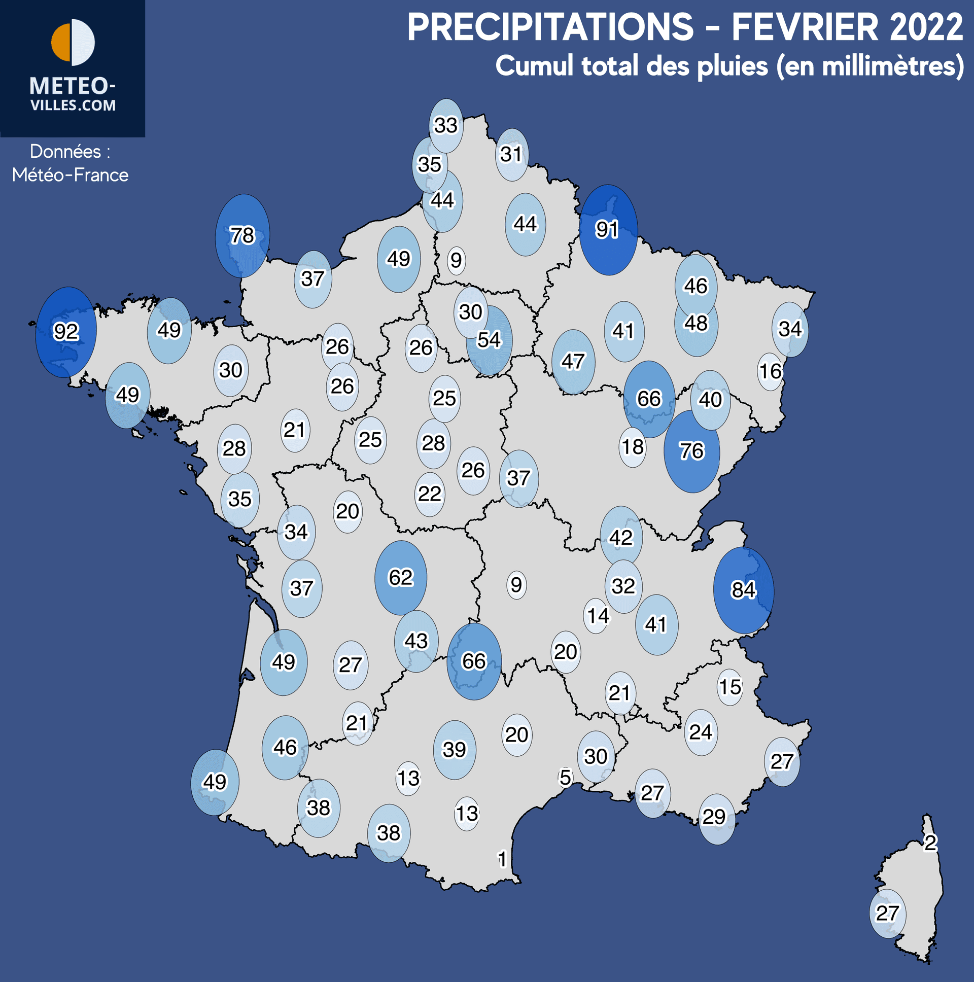 Partout ailleurs, les pluies ont été bien limitées voire quasi-inexistantes au cours du mois. Sur les Pays de la Loire ou encore en région Centre-Val-de-Loire, ce déficit atteint -40 à -60%. Il atteint les -70% le long de la Garonne, et dépasse même les -90% sur le Languedoc-Roussillon ainsi que la façade orientale de la Corse (-90%C à Montpellier, -96% à Bastia, -98% à Perpignan), où la sécheresse continue de s'aggraver après un mois de janvier déjà exceptionnellement aride. Pour la capitale, le bilan est de -27% au Parc Montsouris.