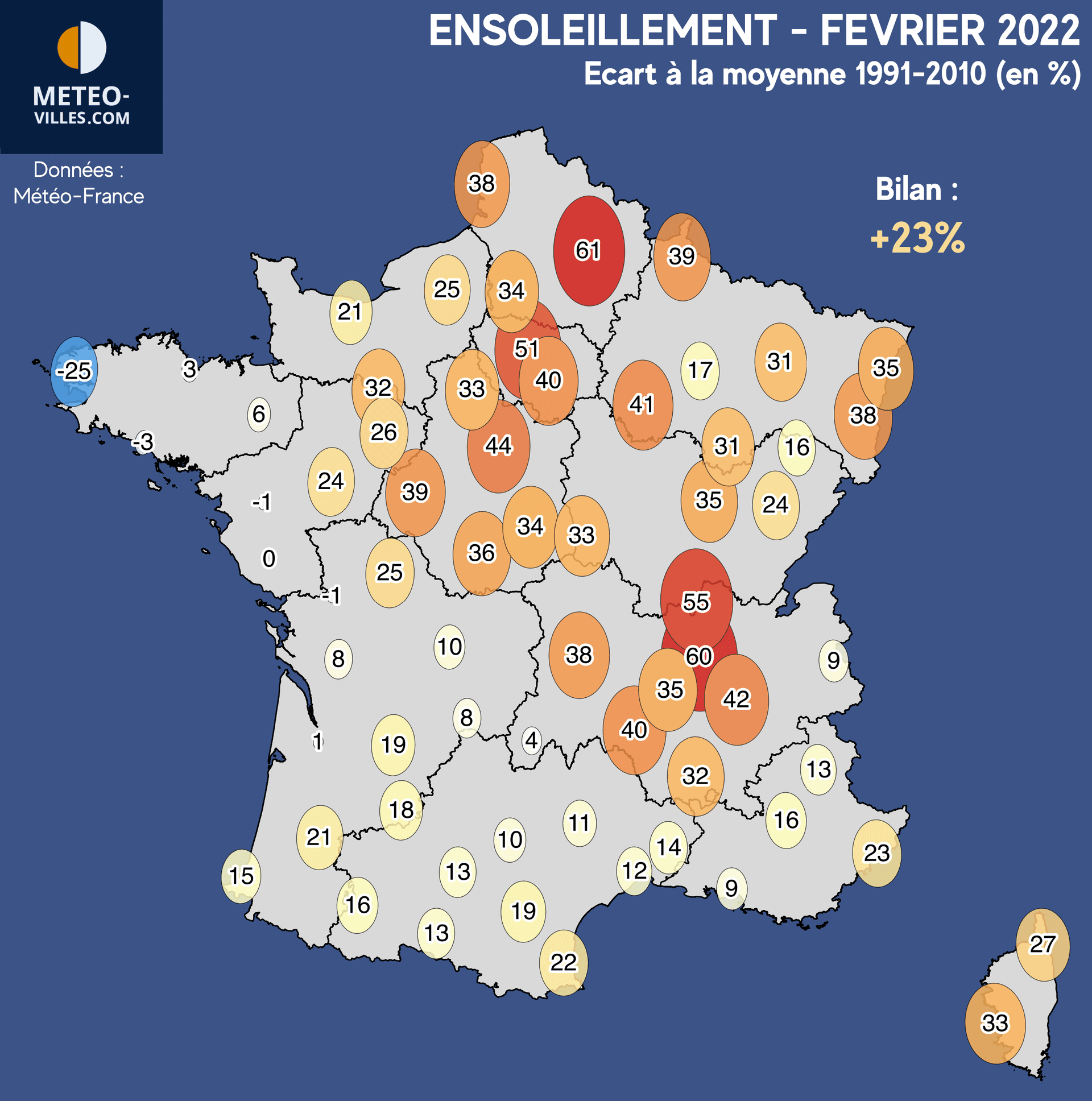Seule la Bretagne sort véritablement du lot avec un mois plus conforme aux moyennes, voire même déficitaire en direction du Finistère (-25% à Brest). A l'inverse, le soleil a été remarquablement généreux en se dirigeant vers l'Est et le Nord, avec un excédent compris entre +30 et +50%, voire même localement au delà (+51% à Paris, +55% à Mâcon, +60% à Lyon, +61% à Saint-Quentin).