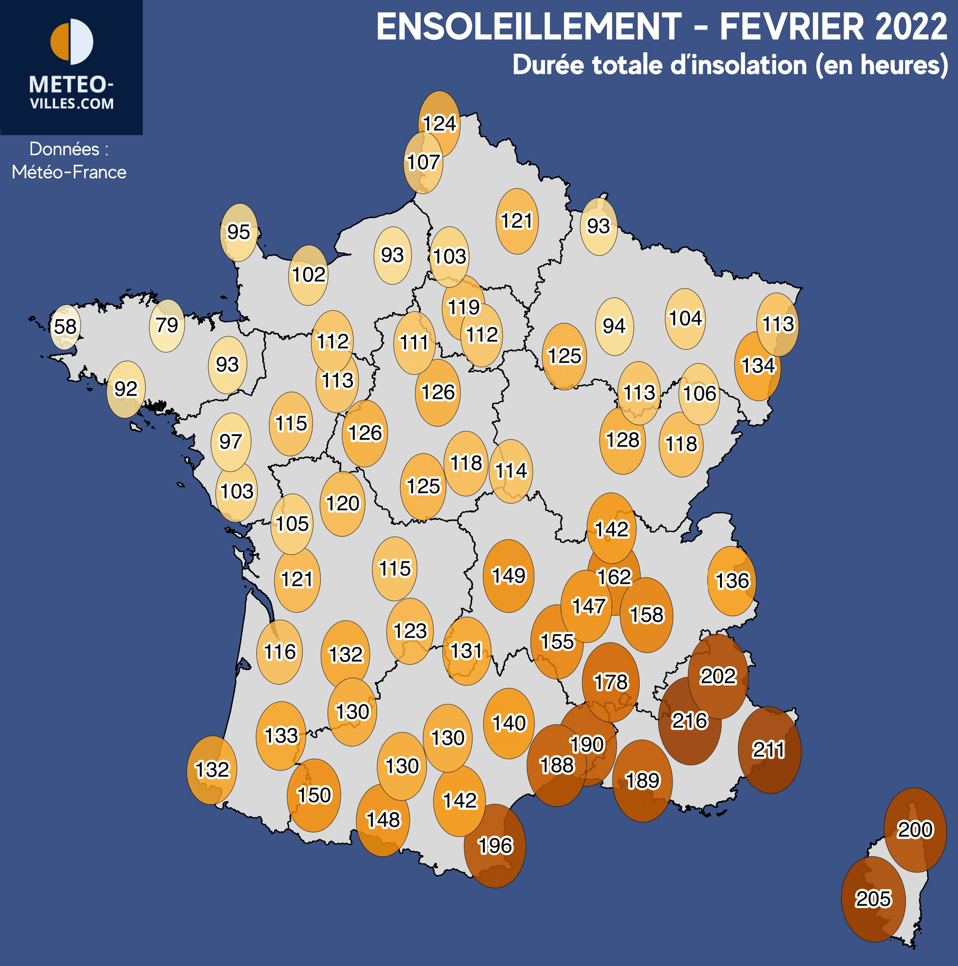 Des Pyrénées à l'Alsace, vous avez pu profiter de 110 à 150h de soleil en moyenne. Mais comme à l'accoutumée, ce sont les villes du Sud-Est qui ont bénéficié du plus grand nombre de journées ensoleillées avec un seuil de 200h dépassé en Corse et Provence (200h à Bastia, 202h à Embrun, 205h à Ajaccio, 211h à Nice et un maximum de 216h à Saint-Auban).