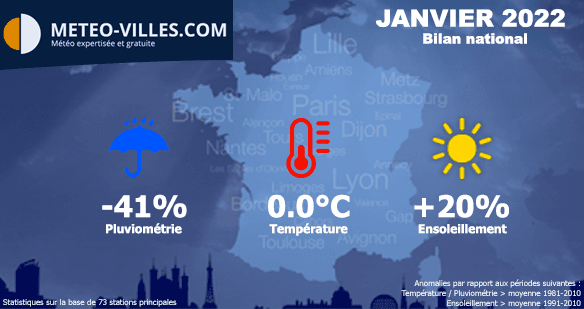 Comme à chaque début de mois, nous vous proposons un bilan climatologique du mois écoulé. Place donc au bilan cartographié du mois de JANVIER 2022 en termes de température, pluviométrie et ensoleillement sur un panel de 73 stations*.