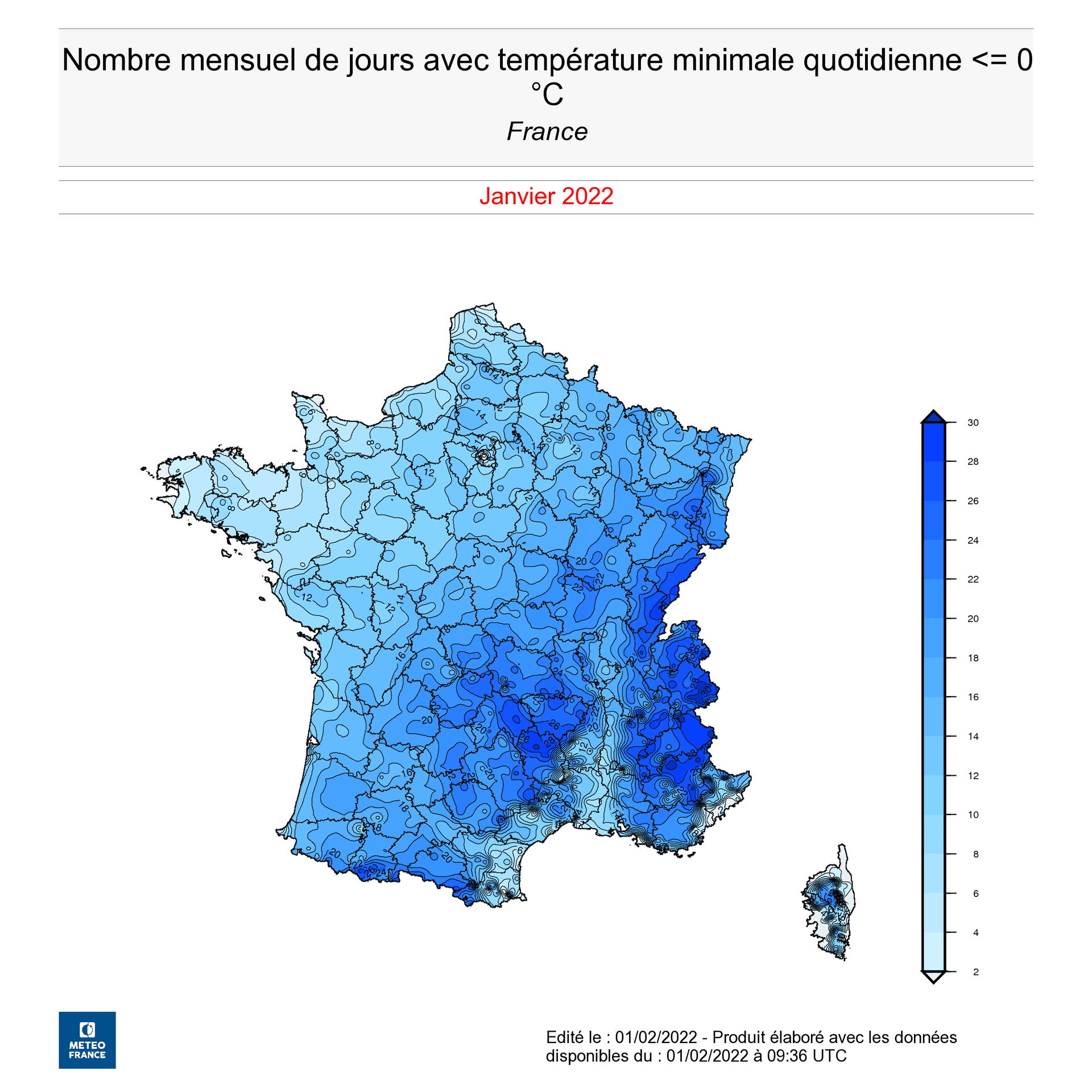 Nombre mensuel de jours avec températures négatives - janvier 2022 - Météo-France / Twitter Gaetan Heymes