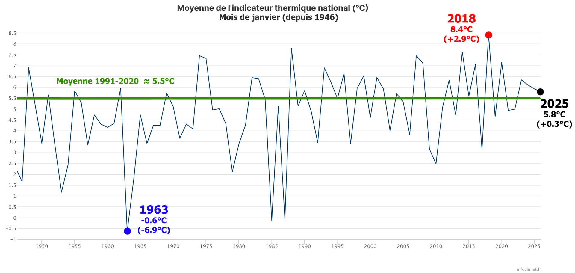 Avec un indicateur thermique national de 5.8°C, ce mois de janvier 2026 finit très légèrement au-dessus des moyennes de saison (+0.3°C). Une valeur bien éloignée des extrêmes observés en janvier 2018 (anomalie de +2.9°C) et surtout de janvier 1963, le plus froid observé en un siècle (anomalie de -6.9°C).