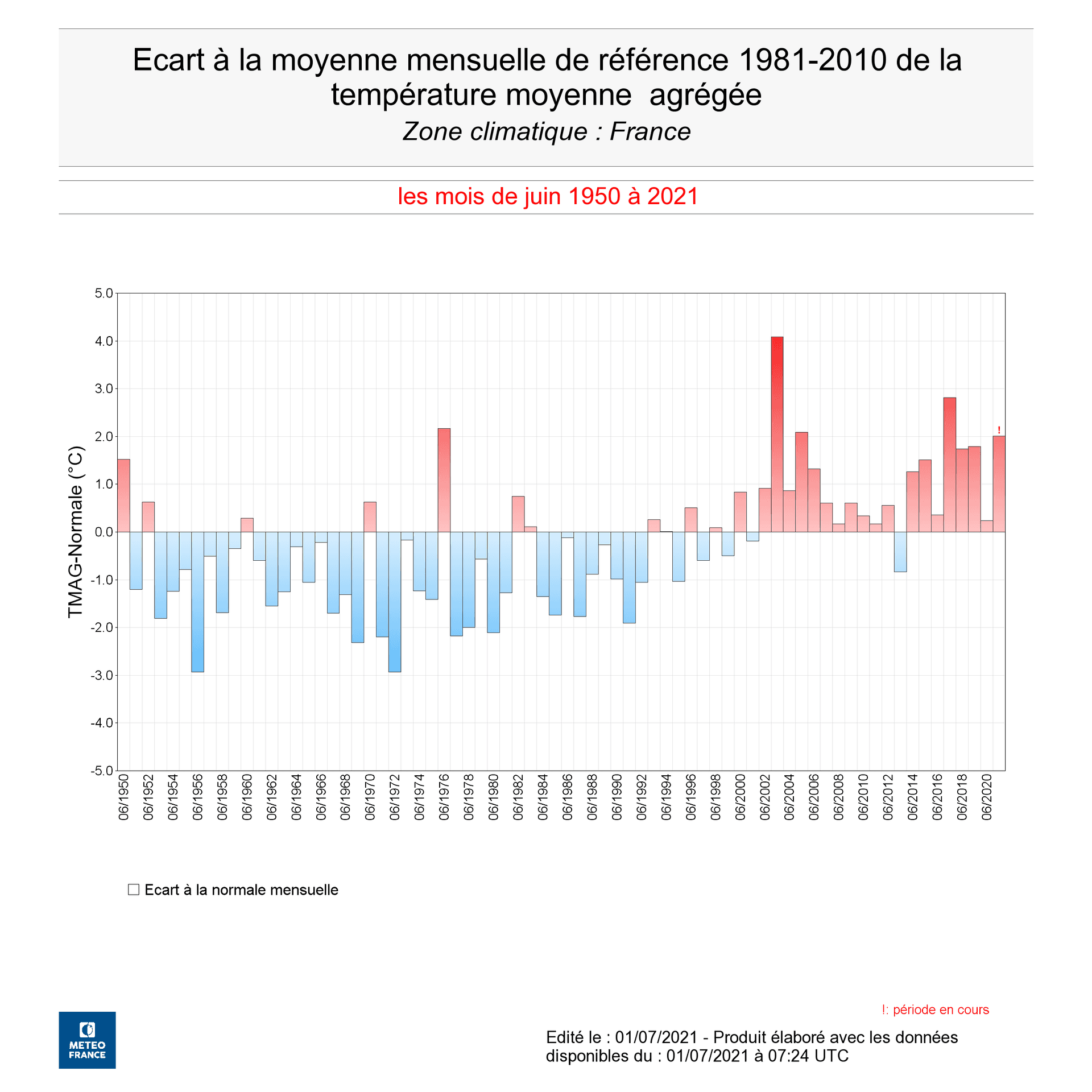 Malgré une impression générale de mois de juin plus frais que la normale en raison d'une instabilité très récurrente et parfois violente, l'anomalie thermique par rapport à la moyenne 1981-2010 atteint +2.0°C, ce qui place juin 2021 en 5ème position des mois de juin les plus chauds depuis 1950, devant juin 2019 qui avait pourtant connu une canicule exceptionnelle.