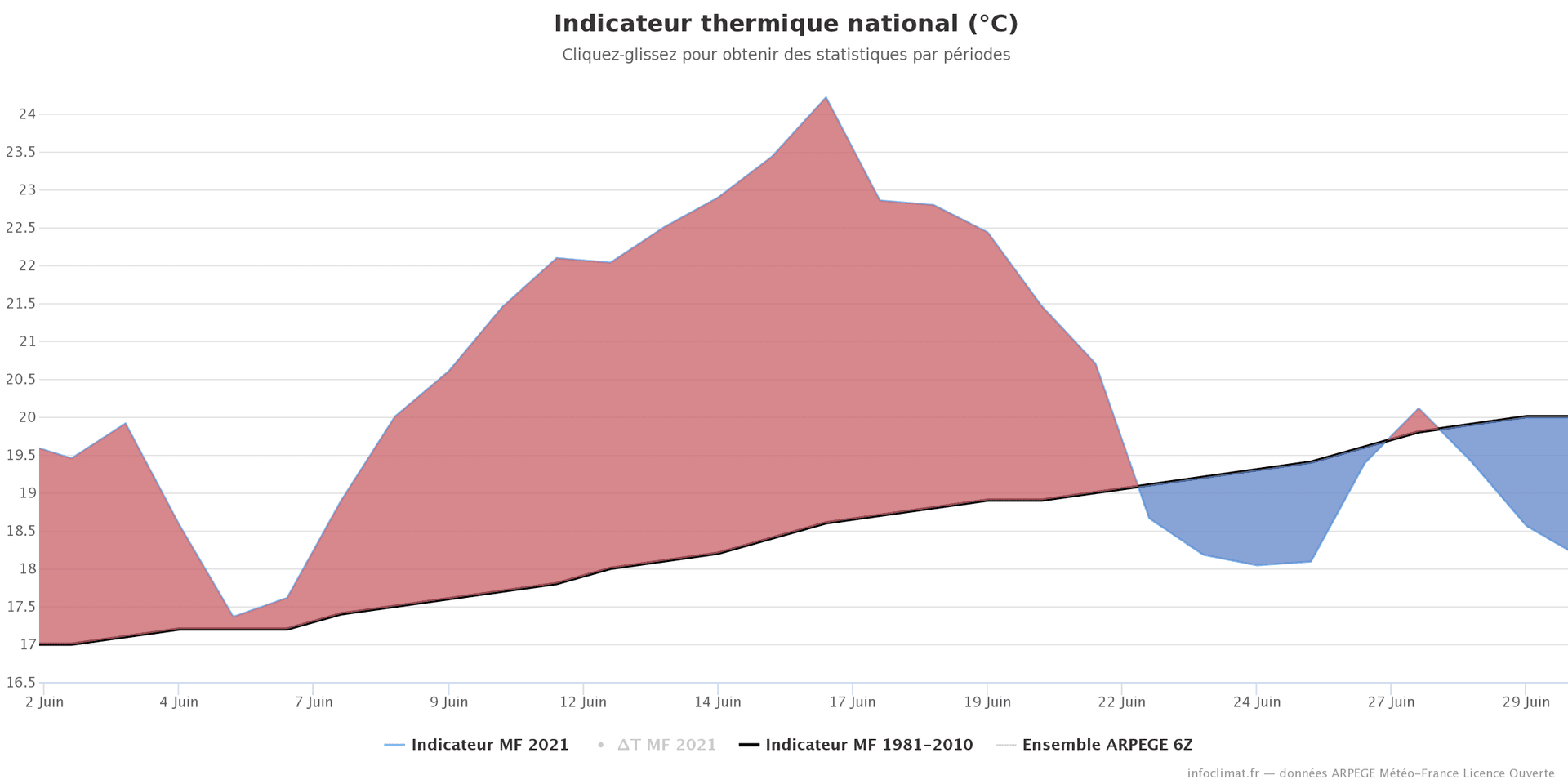 Malgré l'instabilité récurrente, le mois de juin s'est montré plus chaud que la normale sur la France. Sur la totalité du mois, seuls 7 jours ont présenté des températures inférieures aux normales de saison, notamment à partir du 22. Le reste de la période fut marqué par une chaleur estivale précoce, parfois très marquée à la mi-juin.