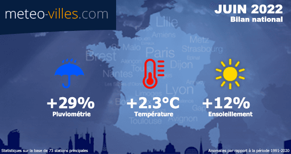 Comme à chaque début de mois, nous vous proposons un bilan climatologique du mois écoulé. Place donc au bilan cartographié du mois de JUIN 2022 en termes de température, pluviométrie et ensoleillement sur un panel de 73 stations*.