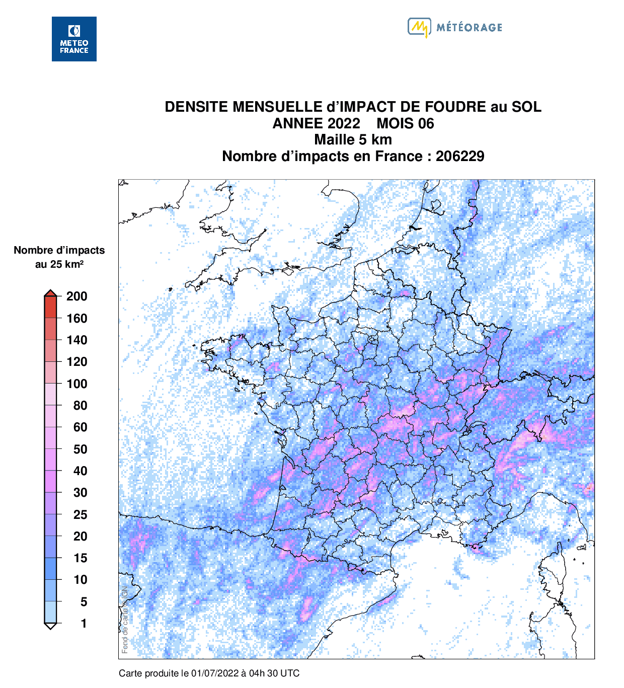 Au total, ce ne sont pas moins de 206.229 impacts de foudre qui ont été détectés par le réseau Météorage au cours du mois... faisant de juin 2022 le mois de juin le plus foudroyé depuis le début des statistiques en 1989. Les régions s’entendant de l'Aquitaine à la Franche-Comté, en passant par le Limousin, l'Auvergne, et le sud de la Bourgogne ont été les plus fréquemment touchés.