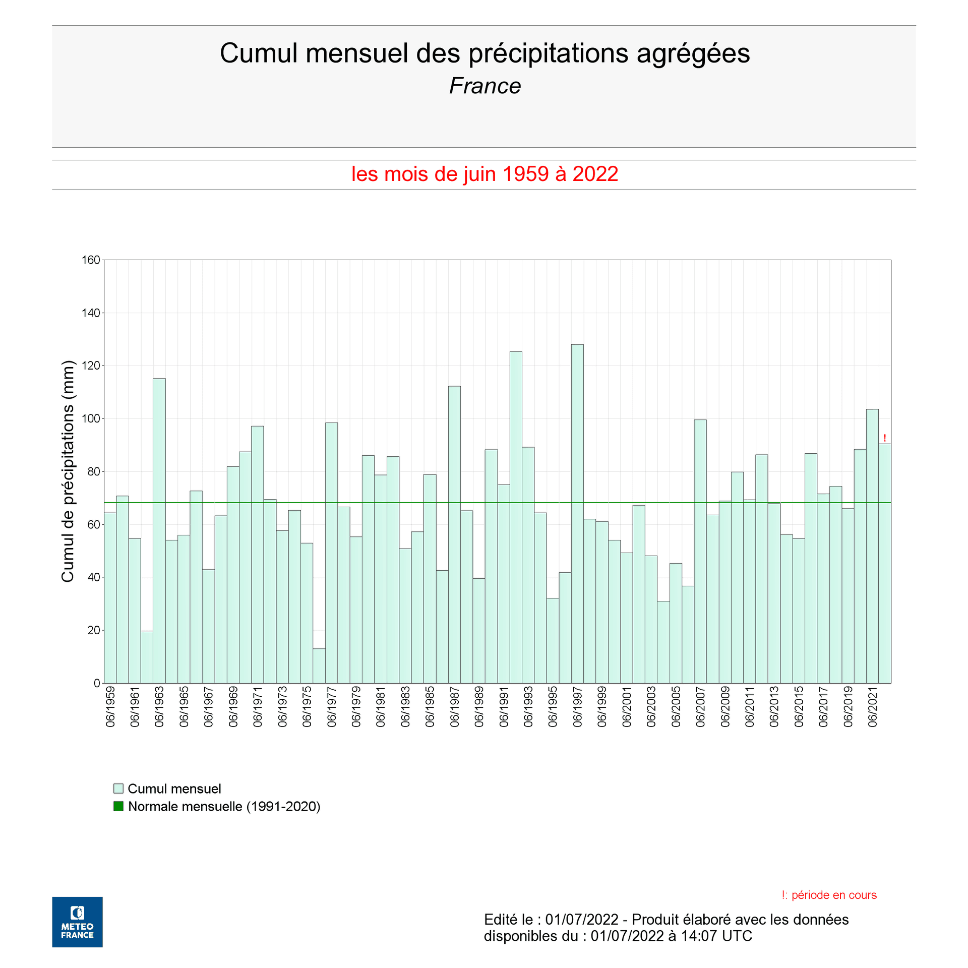 Cumul mensuel des précipitations agrégées en France en juin - période 1959 à 2022 - Météo-France