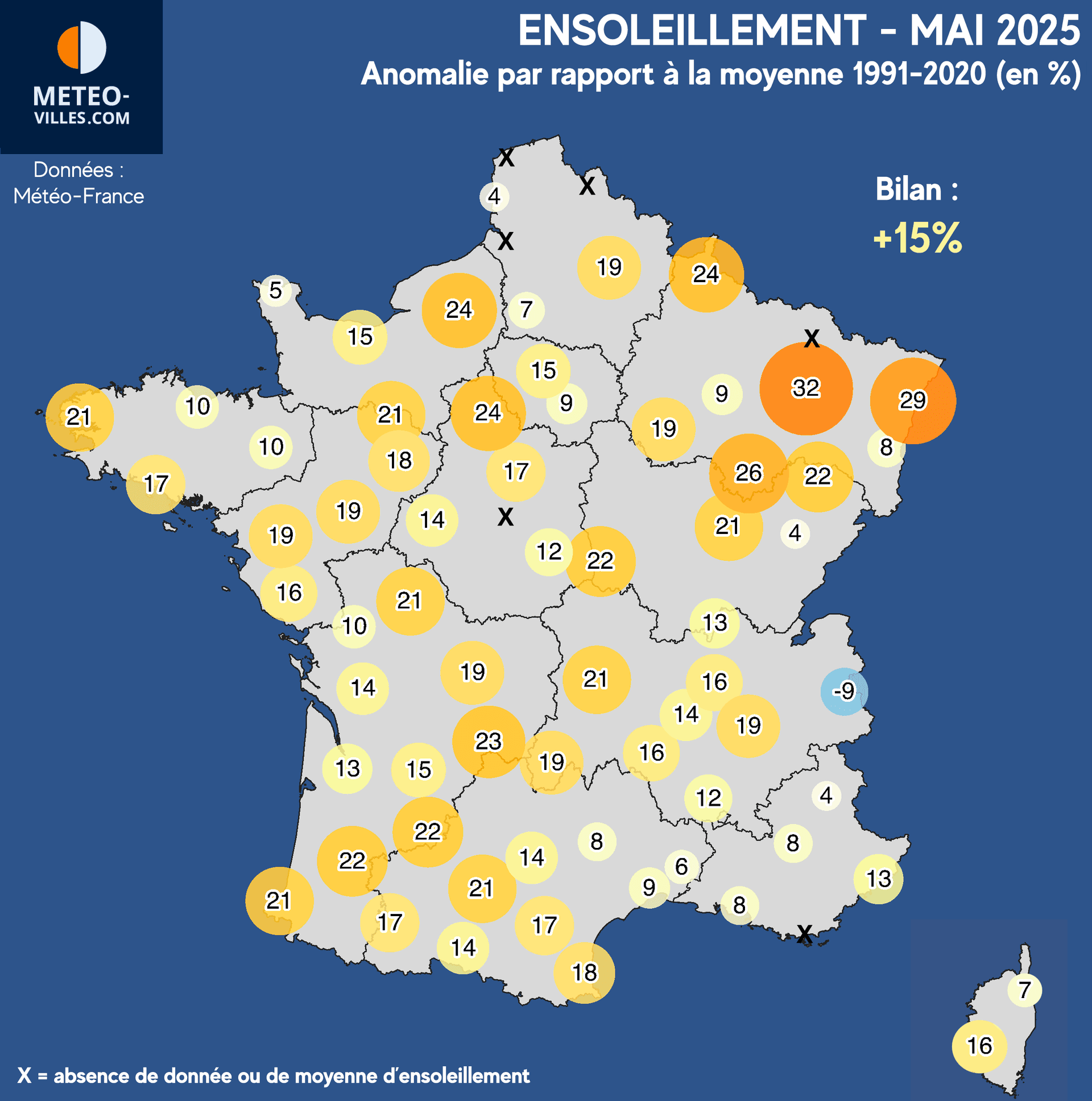 Pour terminer, regardons le bilan du côté de l'ensoleillement. Un soleil omniprésent, puisque ce mois de mai s'est terminé sur un excédent atteignant +15% sur notre panel national de stations.