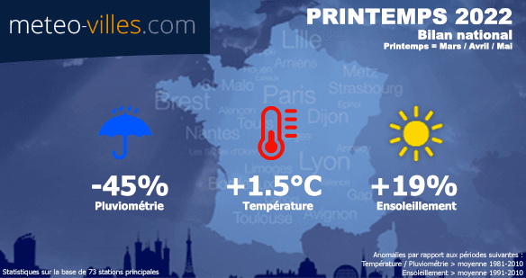 30 de ces stations n'ont même pas eu la moitié des pluies habituellement constatées en cette saison (déficit > 50%). Plus localement en Auvergne-Rhône-Alpes ou encore dans le Sud-Est, ce déficit est assez extrême, fluctuant autour des -70% : notons par exemple -67% à Clermont-Ferrand, -69% à Nice, -73% à Grenoble-St-Geoirs, Lyon et Saint-Etienne, et même jusqu'à -75% à Marignane ! Pour Paris, le déficit a atteint -41% au cours de ce printemps 2022.