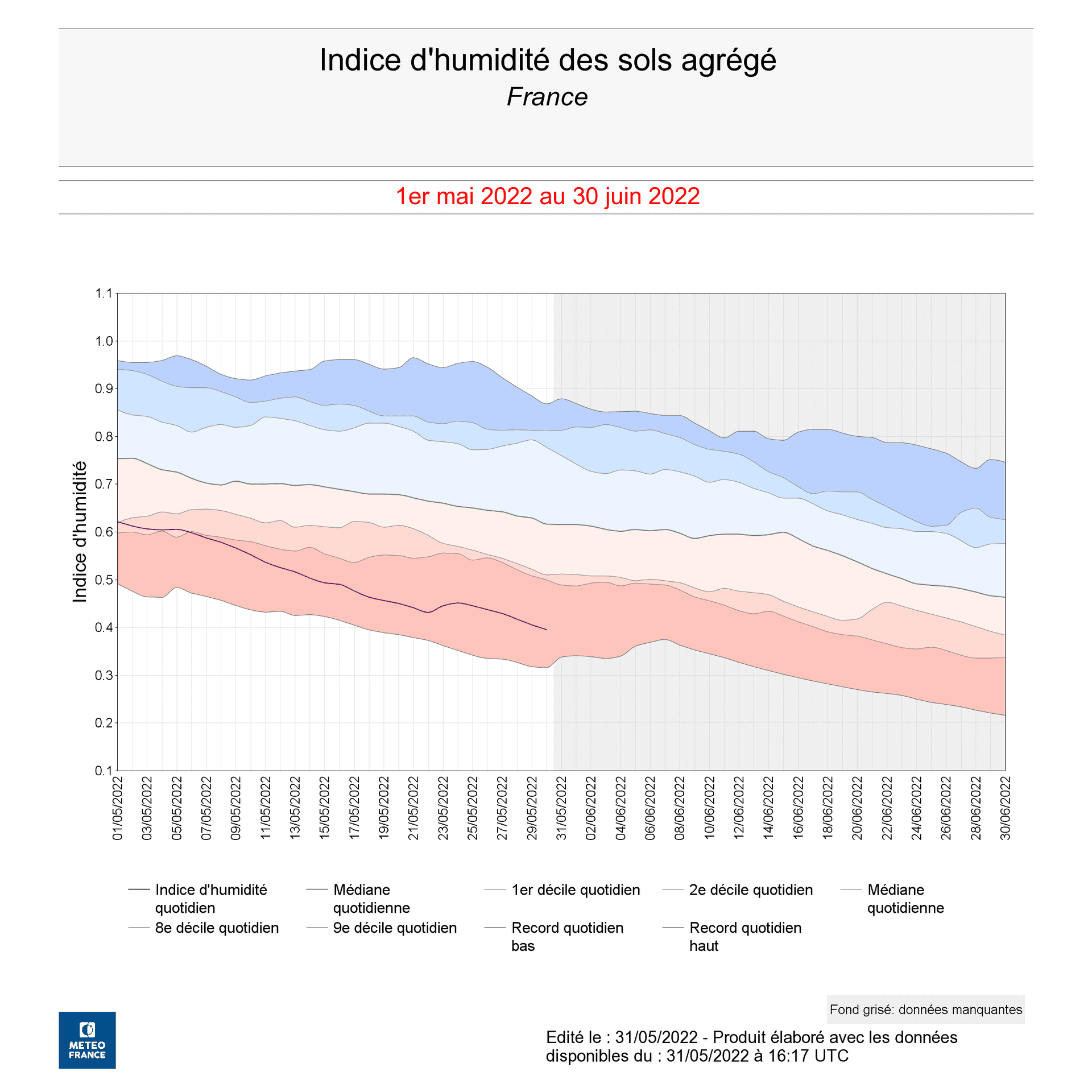 Au final, au 30 mai, la quasi-totalité des départements voient leur humidité des sols atteindre des niveaux particulièrement bas. L'indice d'humidité des sols approchait alors en moyenne 0.4 à l'échelle nationale, tout près du record de 2011 (0.32). Pour le Gard et les Bouches-du-Rhône, il s'agissait même d'un record de sécheresse pour cette date du 30 mai.