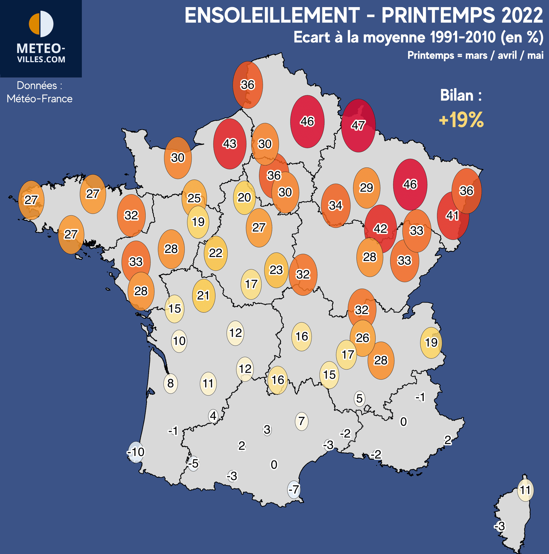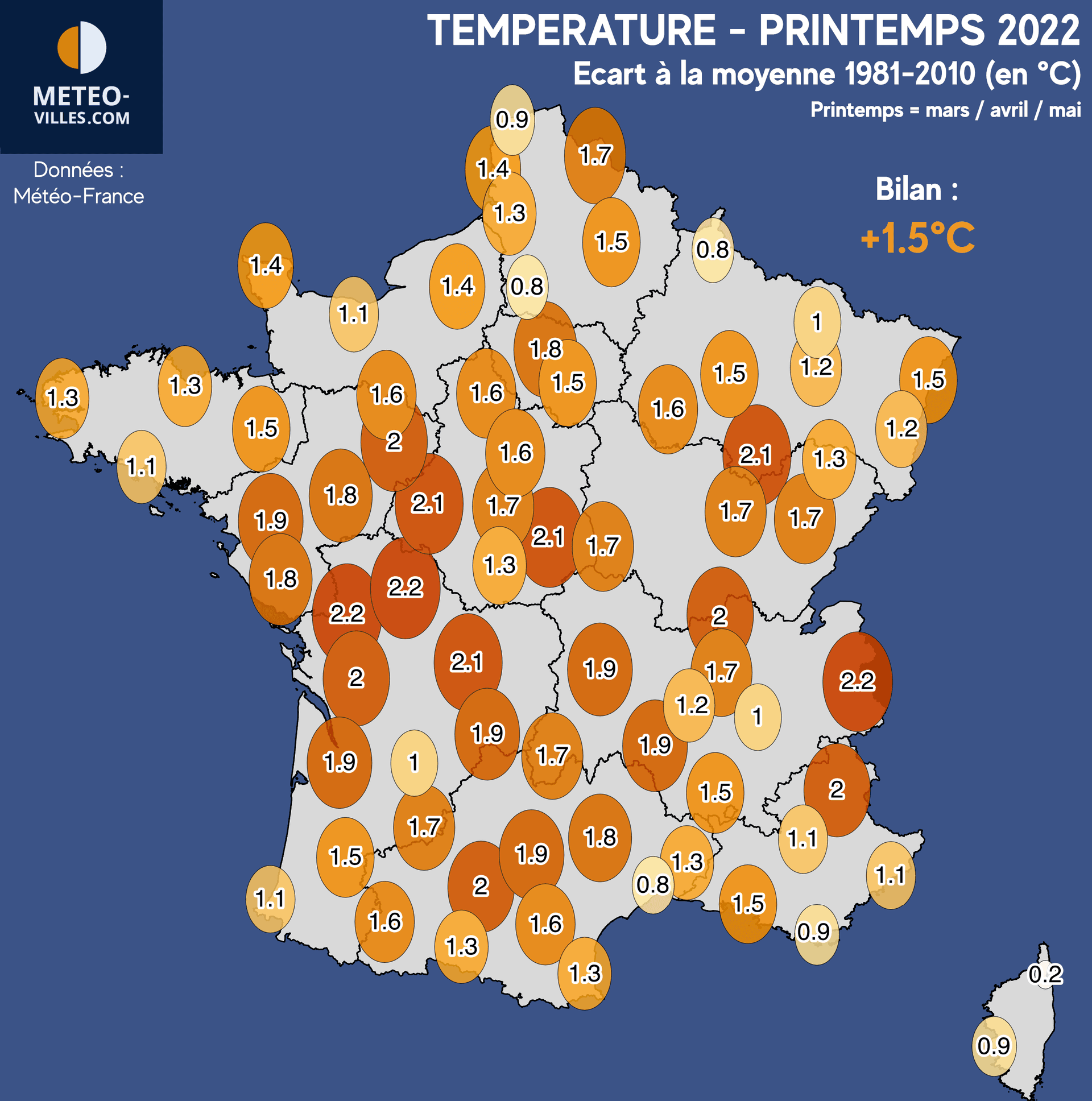 La totalité des villes de notre panel ont vécu un printemps plus chaud que la moyenne. Hormis l'exception de Bastia, quasi dans les normes (+0.2°C), l'ensemble des stations ont un bilan supérieur à +0.8°C. Une large bande centrale du pays a approché voire même atteint les +2°C d'anomalie : notons par exemple +2.1°C à Langres, Bourges et Limoges, et un excédent maximale de +2.2°C à Poitiers, Niort et Bourg-Saint-Maurice.