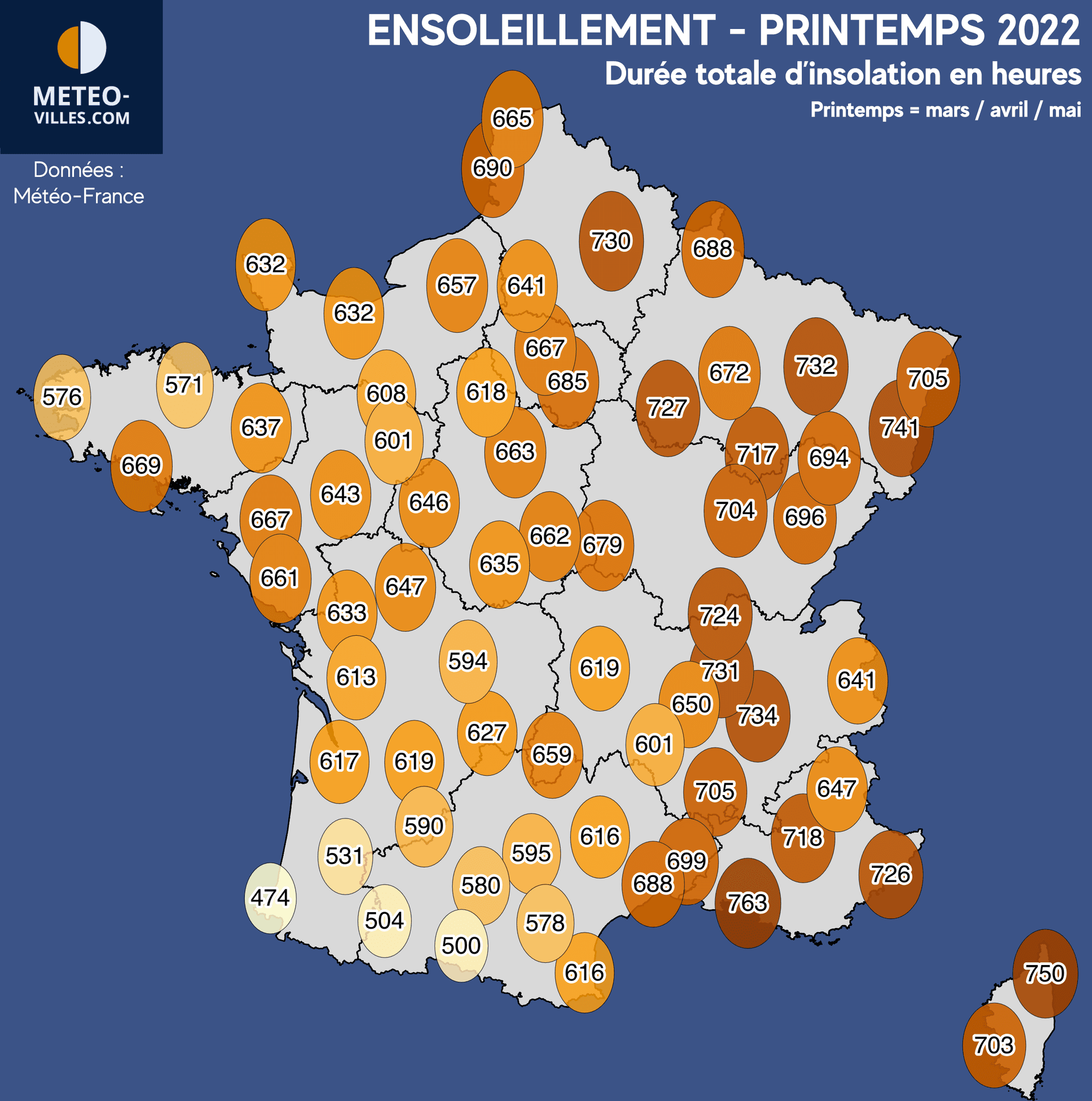 Les villes les plus à l'Est ont même franchi les 700 heures au total, et pas seulement sur le pourtour Méditerranéen ! En effet, certaines villes des Hauts-de-France ou encore du Grand-Est peuvent se targuer d'avoir pu profiter d'autant d'heures de soleil que certaines villes provençales voire même au delà : notons 727h à Troyes, 730h à Saint-Quentin, 732h à Metz ou encore 741h à Colmar... contre 688h à Montpellier, 699h à Nîmes, 703h à Ajaccio ou encore 726 heures à Nice ! Les villes de Bastia (750h) et de Marignane (763h) trustent toutefois le haut du podium.