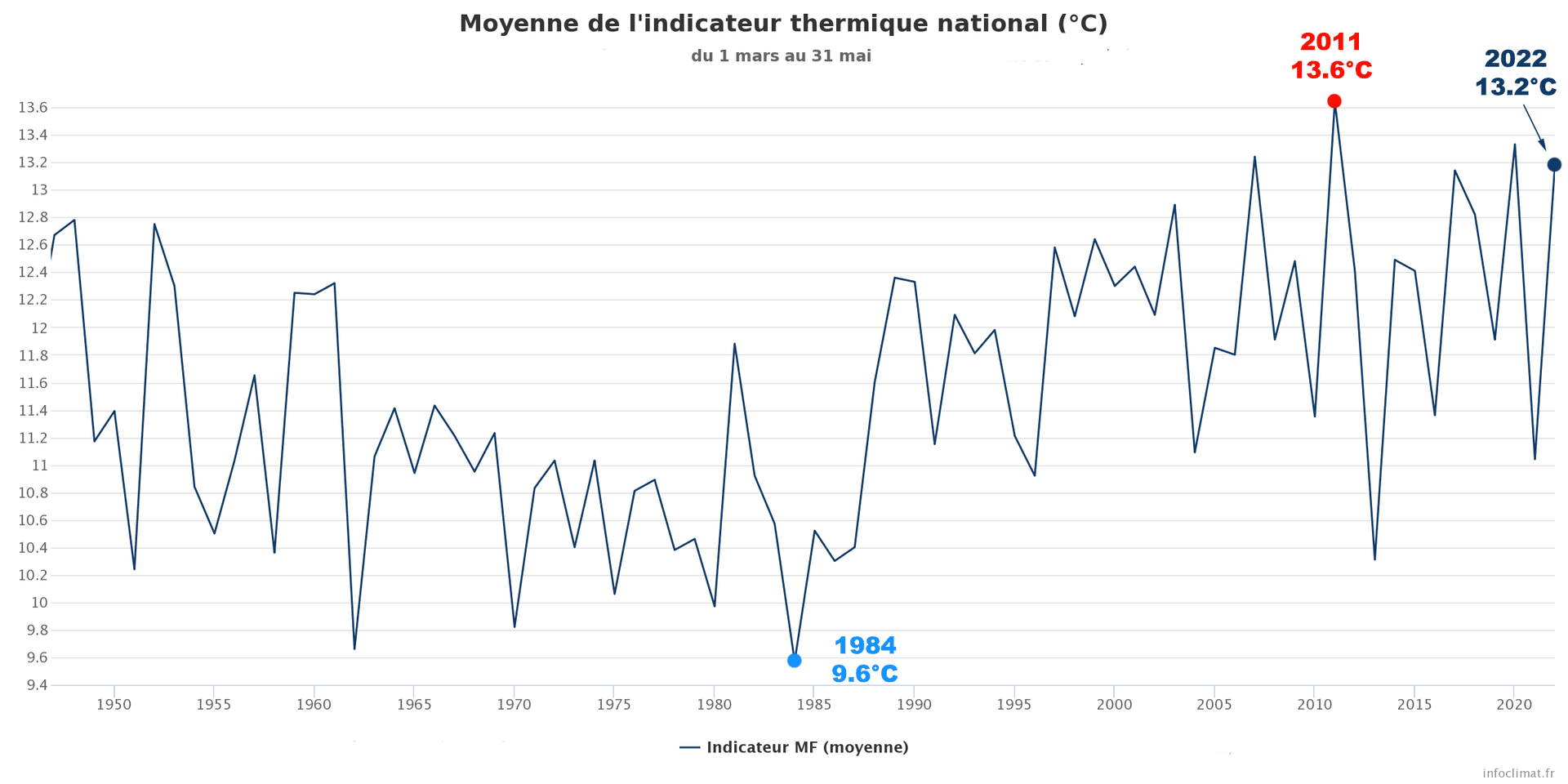 Indicateur thermique national au printemps (mars-avril-mai) depuis 1947 - Infoclimat