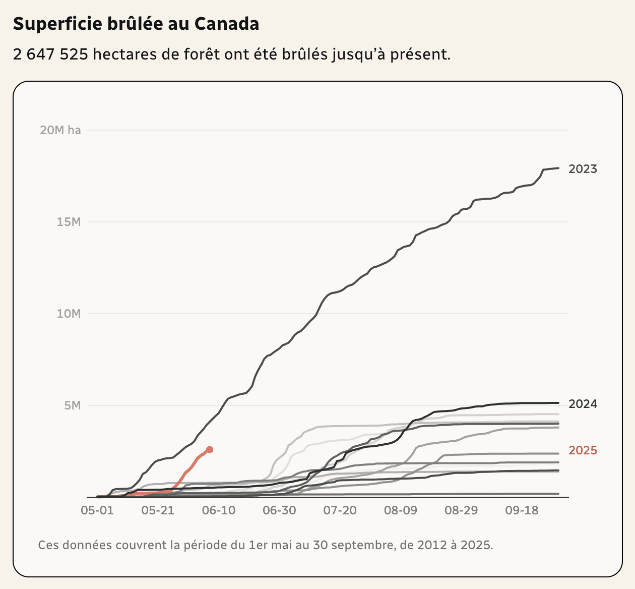 Si les incendies des forêts boréales (Canada et Sibérie) sont fréquents en saison chaude, leur ampleur a véritablement explosé ces dernière années. L'année de référence reste 2023, mais l'activité de cette année 2025 est au dessus de 2024 !