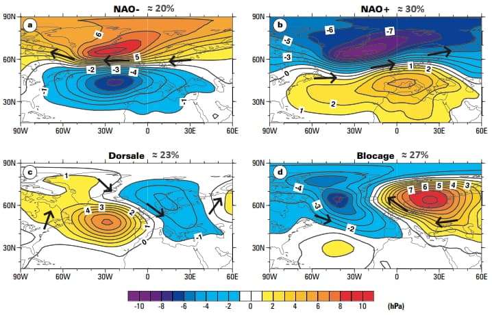 En Europe, on distingue 4 régimes de temps. Le plus fréquent est le régime de NAO+ (environ 30% du temps), correspondant à un anticyclone vers les Açores et la Méditerranée et des dépressions sur le nord de l'Atlantique, apportant sur l'Europe et la France un flux océanique (circulation zonale). À l'inverse, le régime de NAO- est le moins fréquent (environ 20% du temps). Dans cette situation, les centres d'action s'inversent avec un anticyclone aux hautes latitudes et des dépressions des Açores à la Méditerranée, faisant circuler les vents d'est en ouest. C'est bien ce régime de temps qui est en train de se mettre en place.